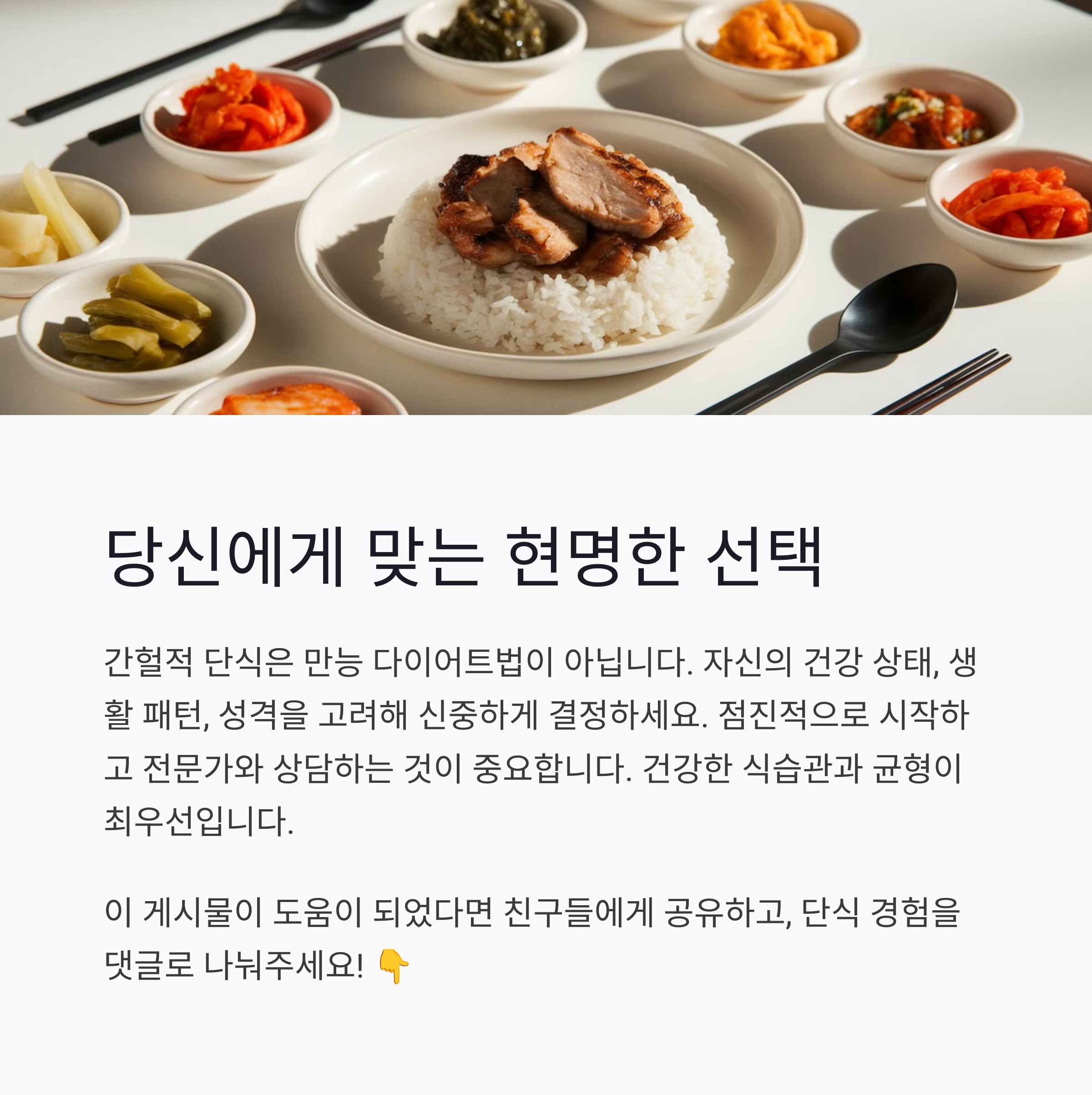 여러분은 어떠세요? 간헐적 단식에 도전해보고 싶으신가요? 아니면 이미 경험해보셨나요?