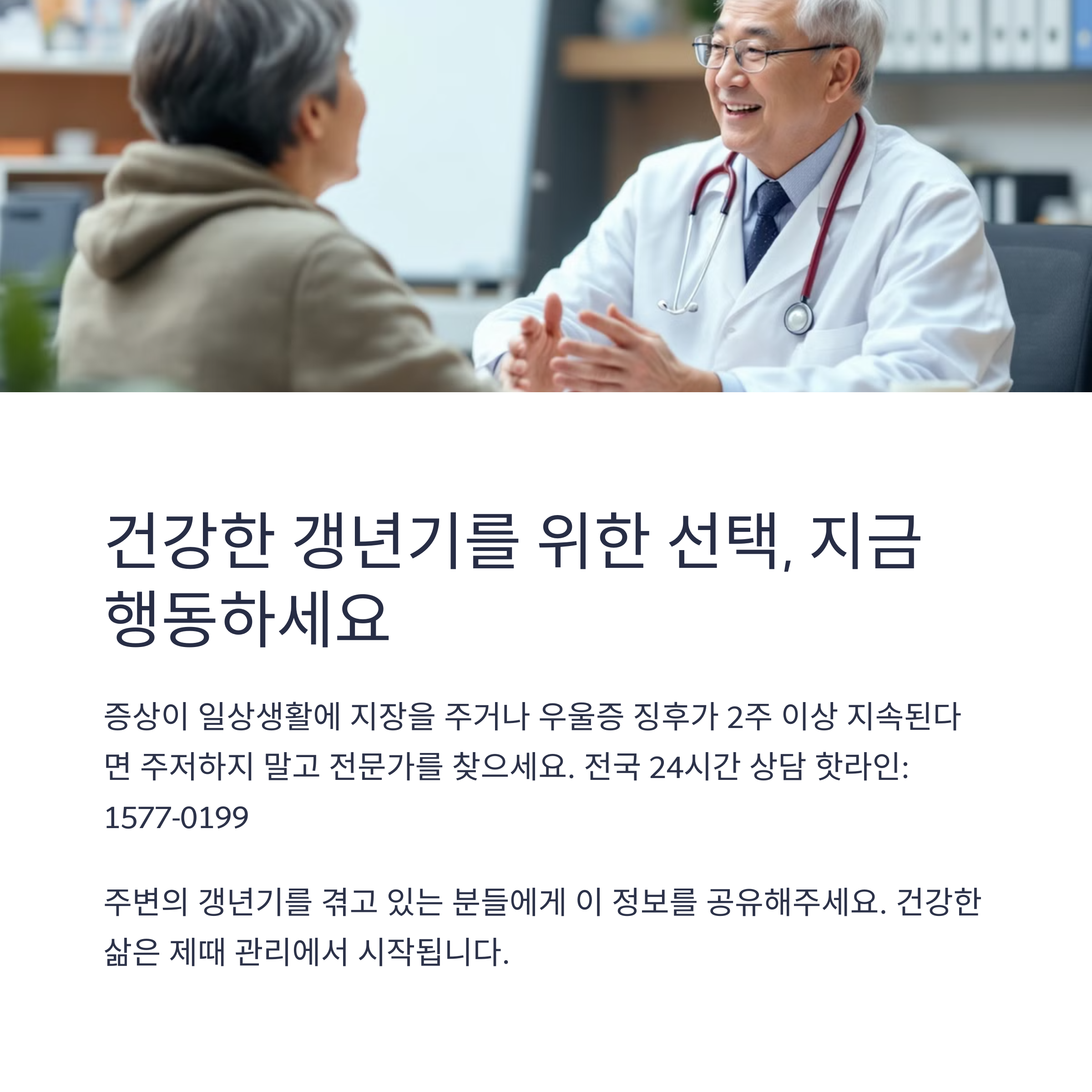 갱년기는 피할 수 없는 자연스러운 과정이지만, 증상을 완화하고 건강하게 관리하는 방법은 분명히 있습니다. 무엇보다 자신의 상태를 정확히 인지하는 것이 첫 단계입니다.