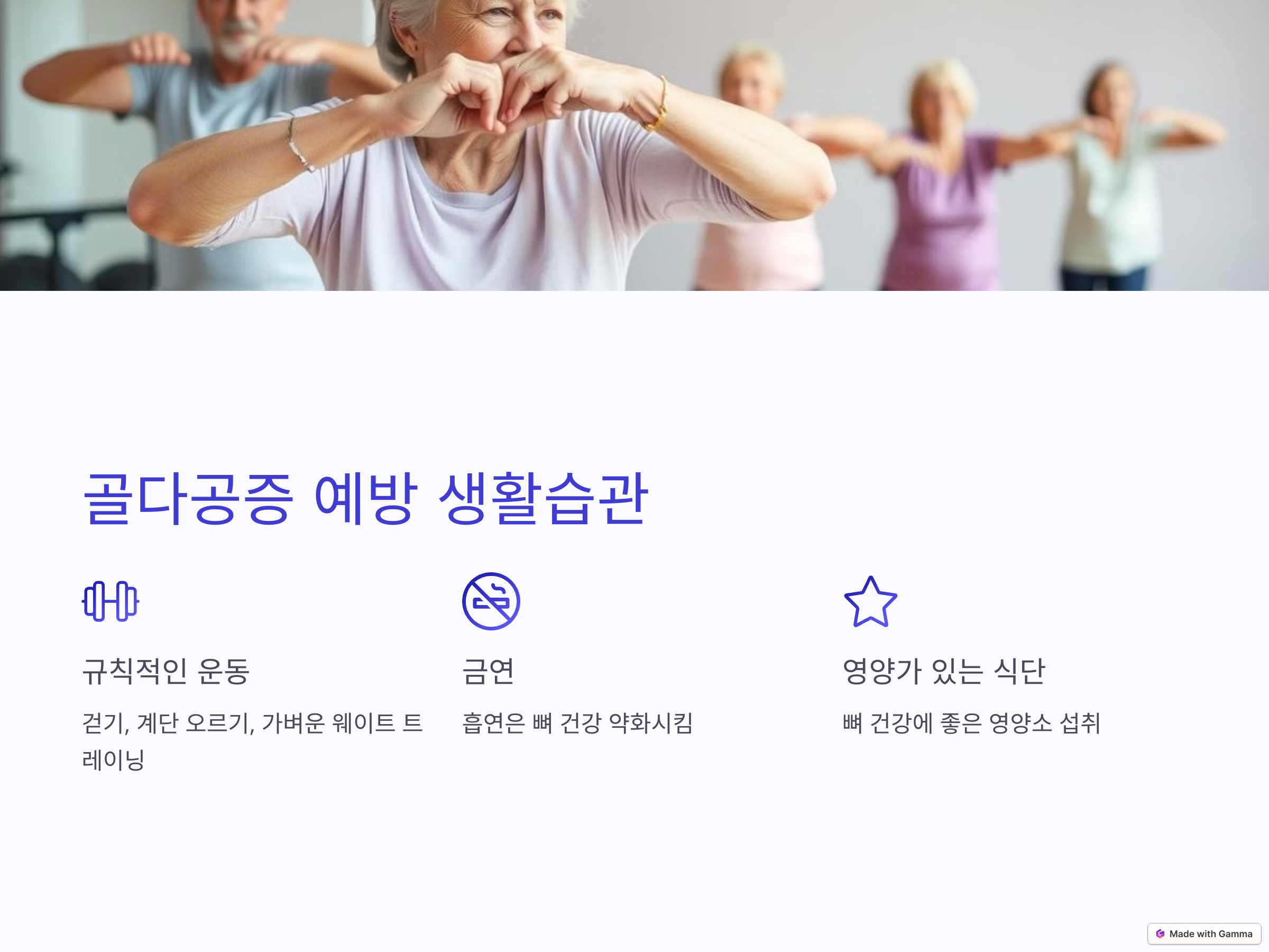 - 금연과 절주: 흡연과 과음은 뼈 건강을 약화시키므로 가능한 피하는 것이 좋습니다.