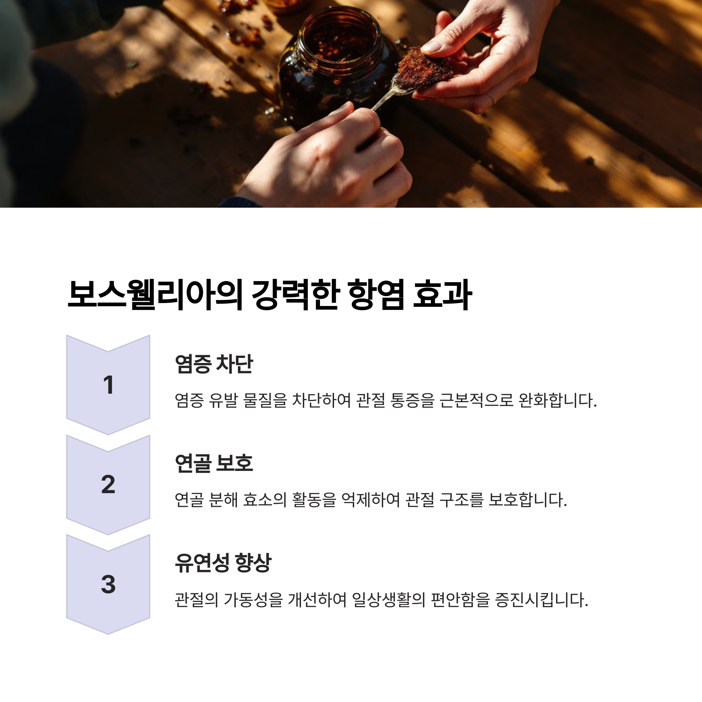 특히 주목할 만한 점은 '뉴트리언트(Nutrients)' 저널에 발표된 연구에서 보스웰리아와 그 추출물이 이부프로펜보다 통증과 경직 완화, 관절 기능 개선에 더 효과적이었다는 결과입니다. 일반적으로 최소 4주 이상 복용해야 효과를 볼 수 있어요.