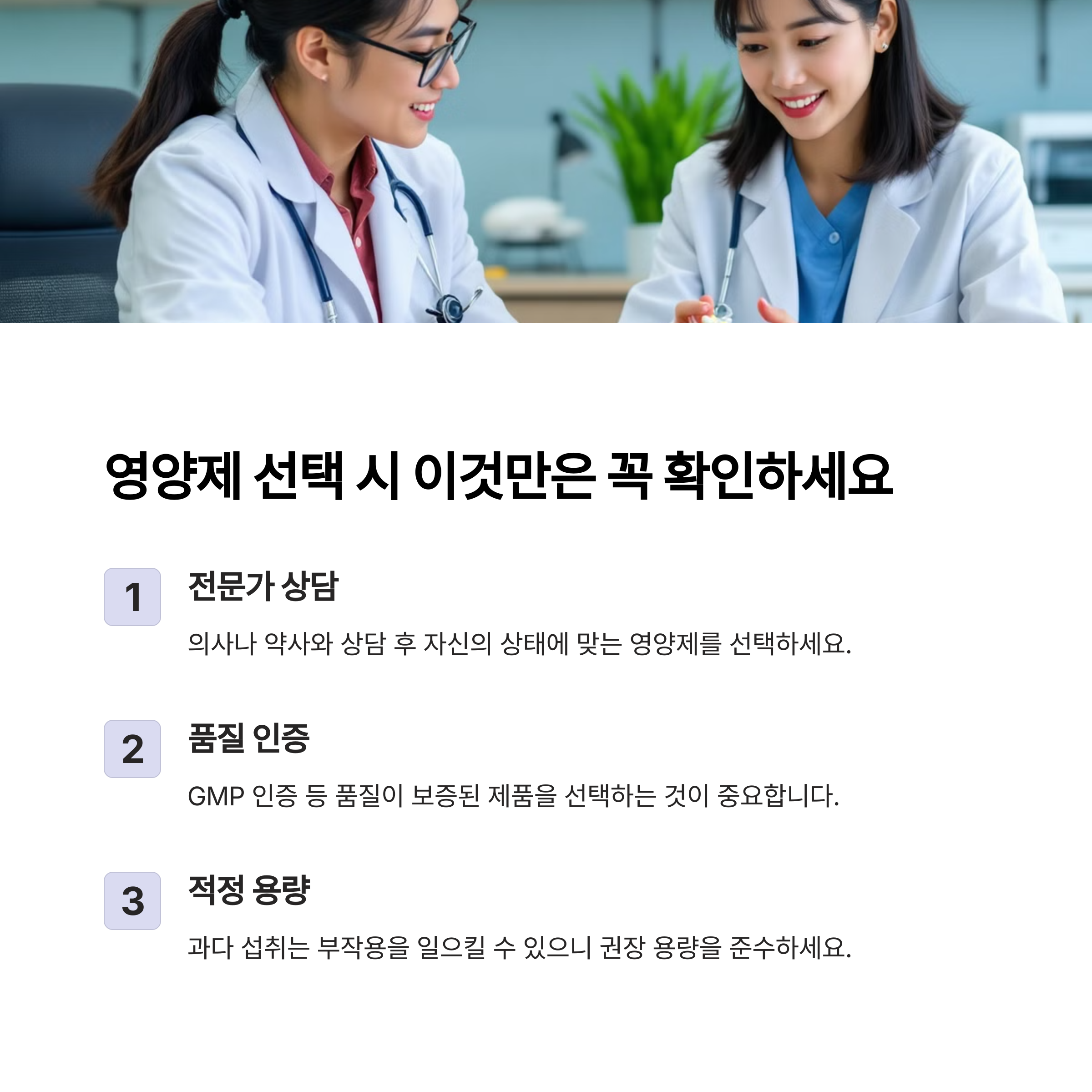 - 의사와 상담하기: 특히 다른 약물을 복용 중이거나 기저 질환이 있는 경우, 영양제 섭취 전 의사와 상담하는 것이 중요합니다.