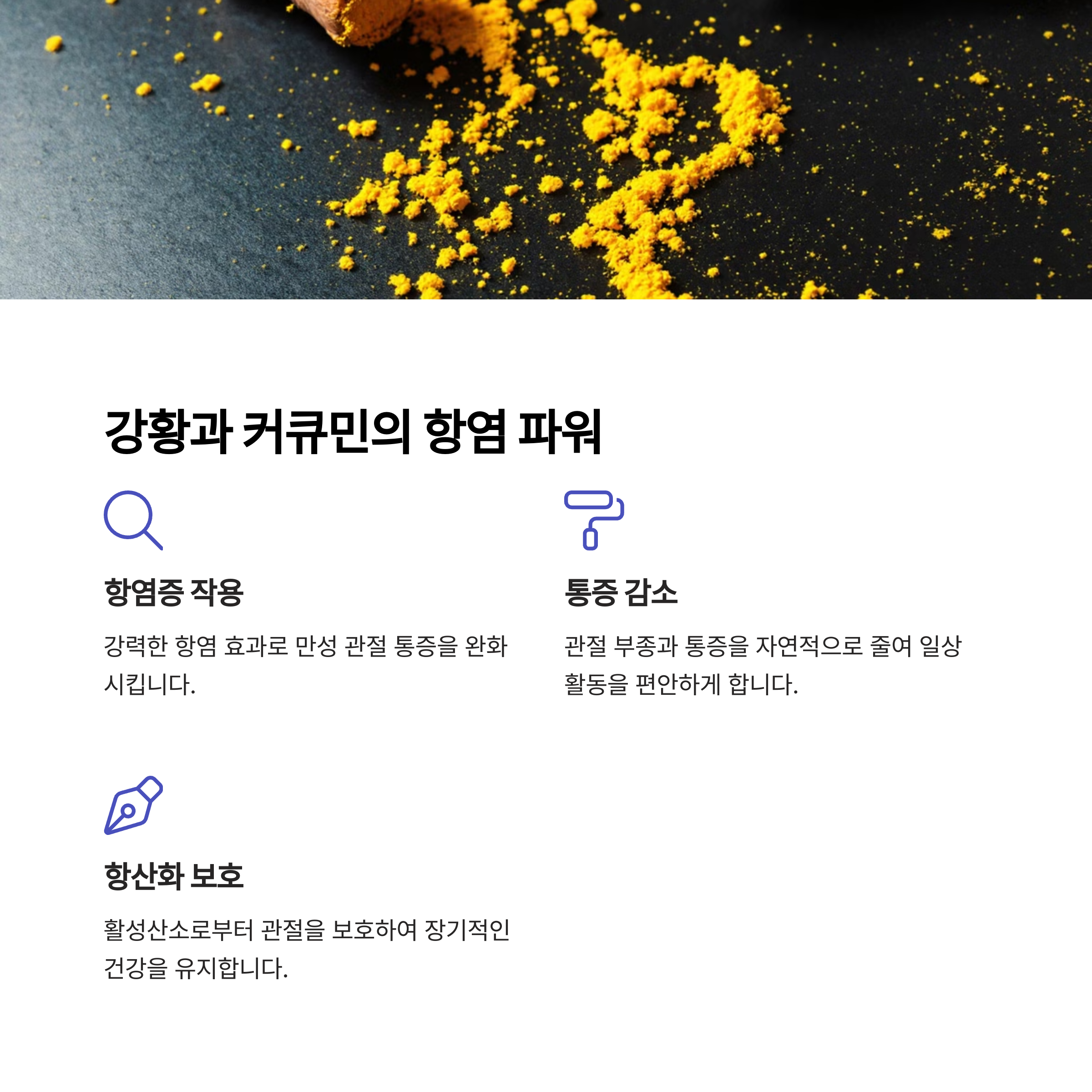 강황(터메릭)은 카레 파우더에서 노란색을 내는 향신료로, 수세기 동안 전통 의학에서 사용되어 왔어요. 강황에 포함된 커큐민이라는 화합물은 강력한 항염증 효과가 있어 관절 통증 완화에 도움을 줍니다.