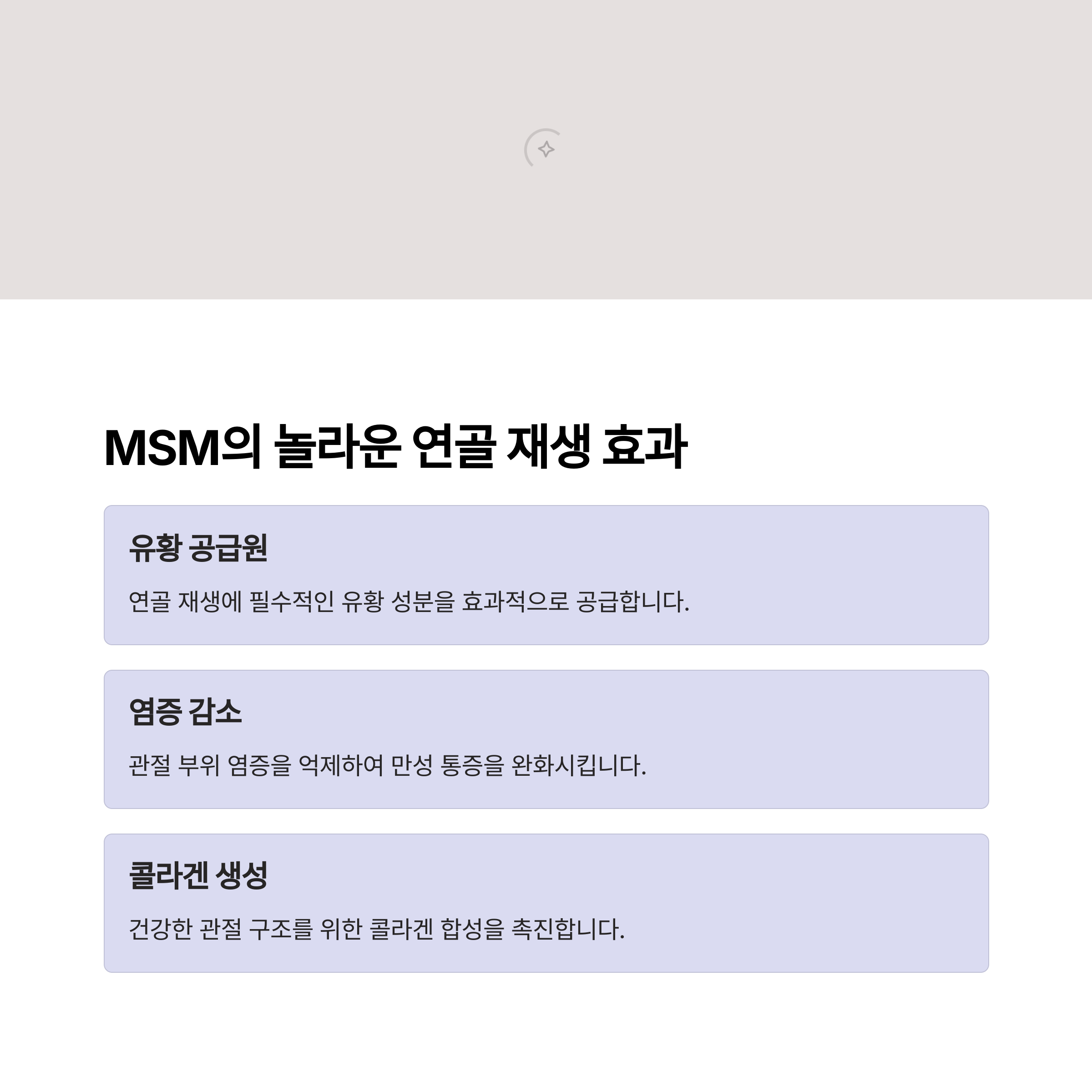 🔍 효과적인 섭취 방법: MSM은 글루코사민, 콘드로이틴과 함께 복용하면 시너지 효과를 볼 수 있어요. 시중에는 MSM과 글루코사민, MSM과 콘드로이틴 조합 제품들이 많이 있습니다.