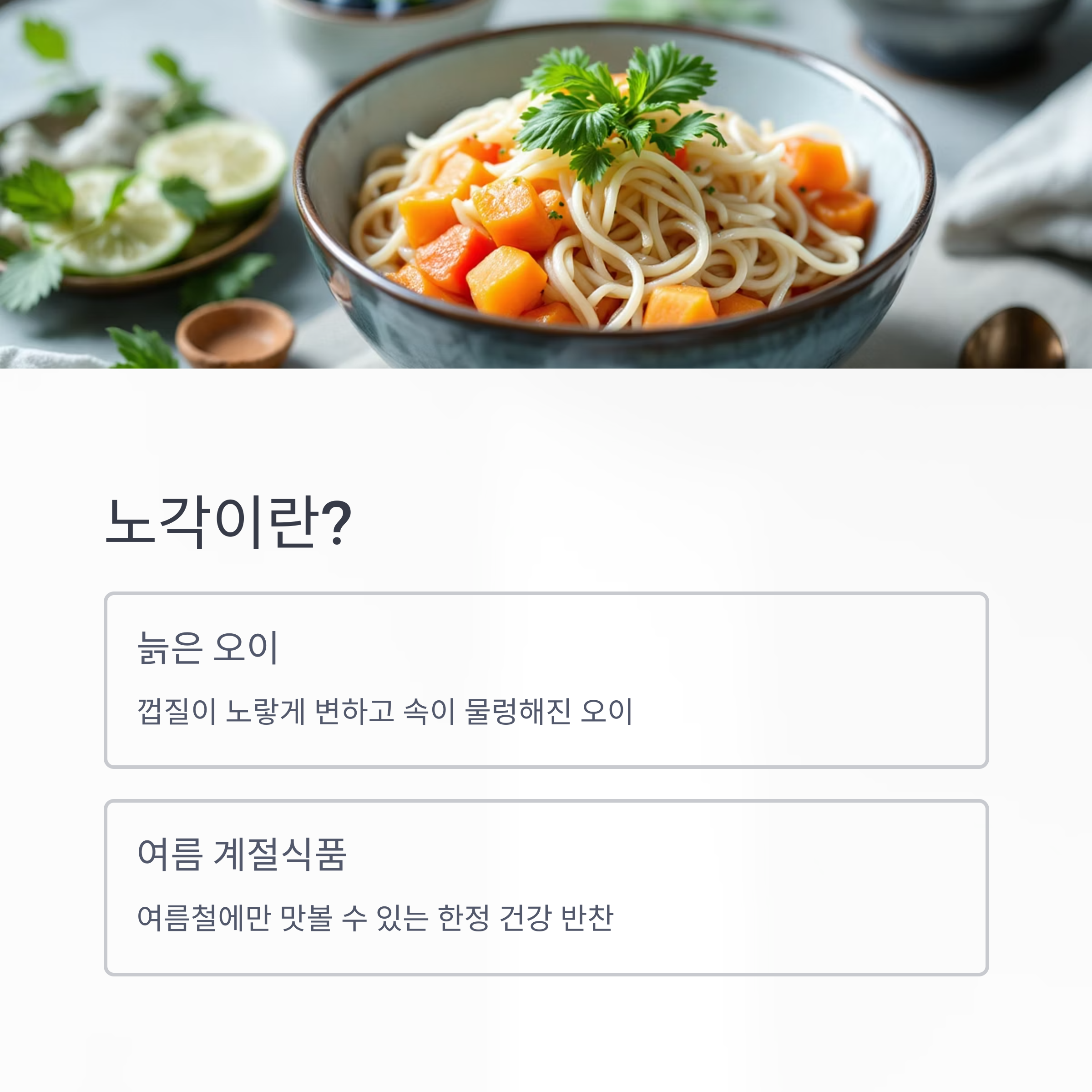 노각은 늙은 오이를 말해요. 오이를 오래 두면 껍질이 노랗게 변하고, 속이 물렁해지면서 수분이 가득해지죠. 여름철에만 맛볼 수 있는 계절 한정 건강 반찬이에요.
