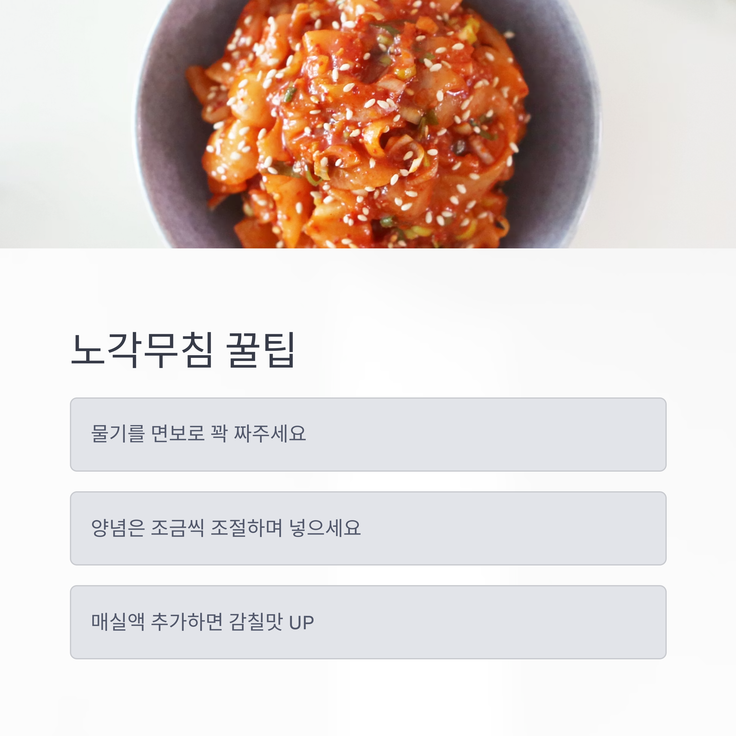 절이는 시간을 충분히 하고, 물기를 꼭 짜서 무쳐보세요!