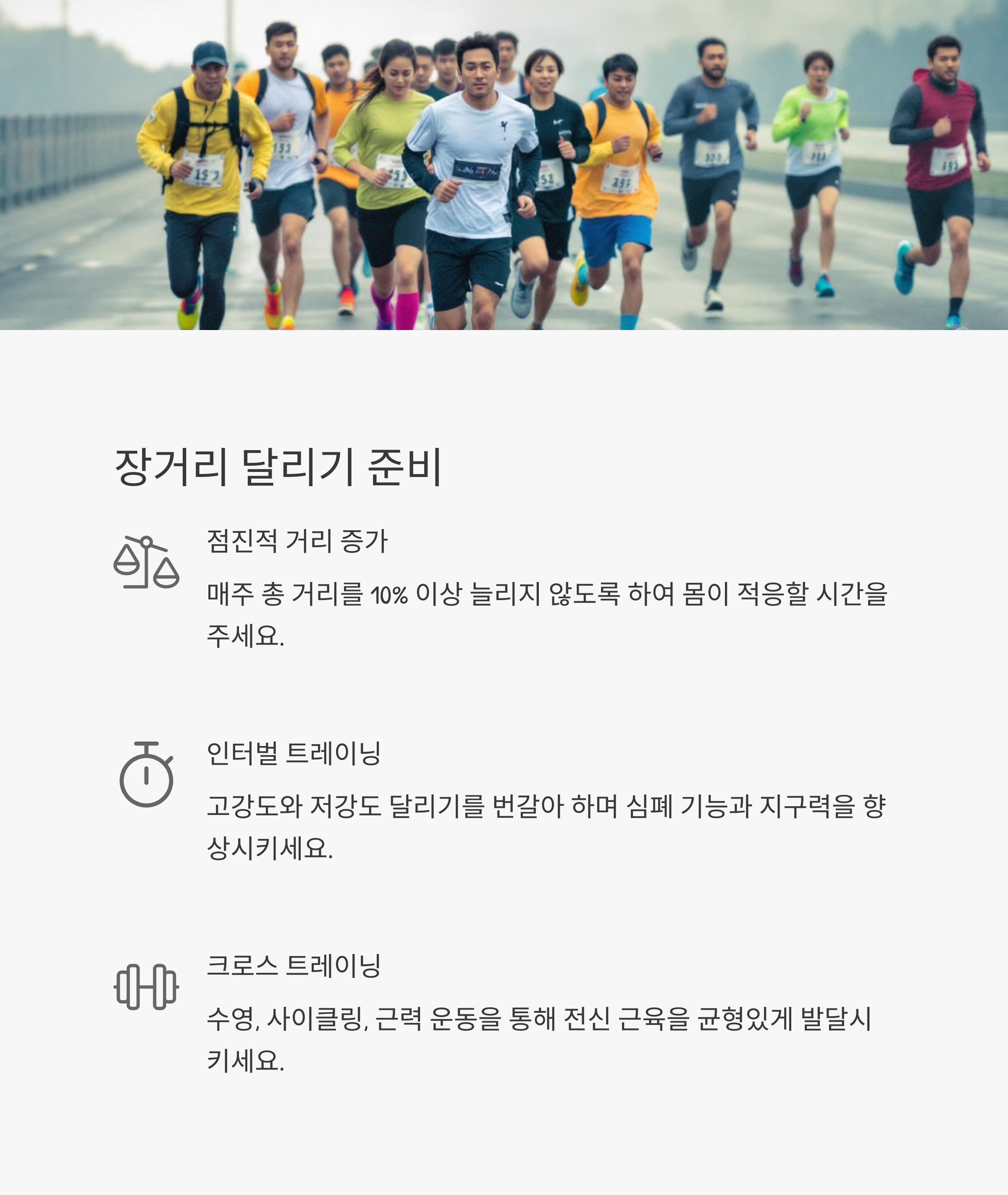 - 점진적 거리 증가: 매주 총 달리기 거리를 10% 이내로 늘려가세요.