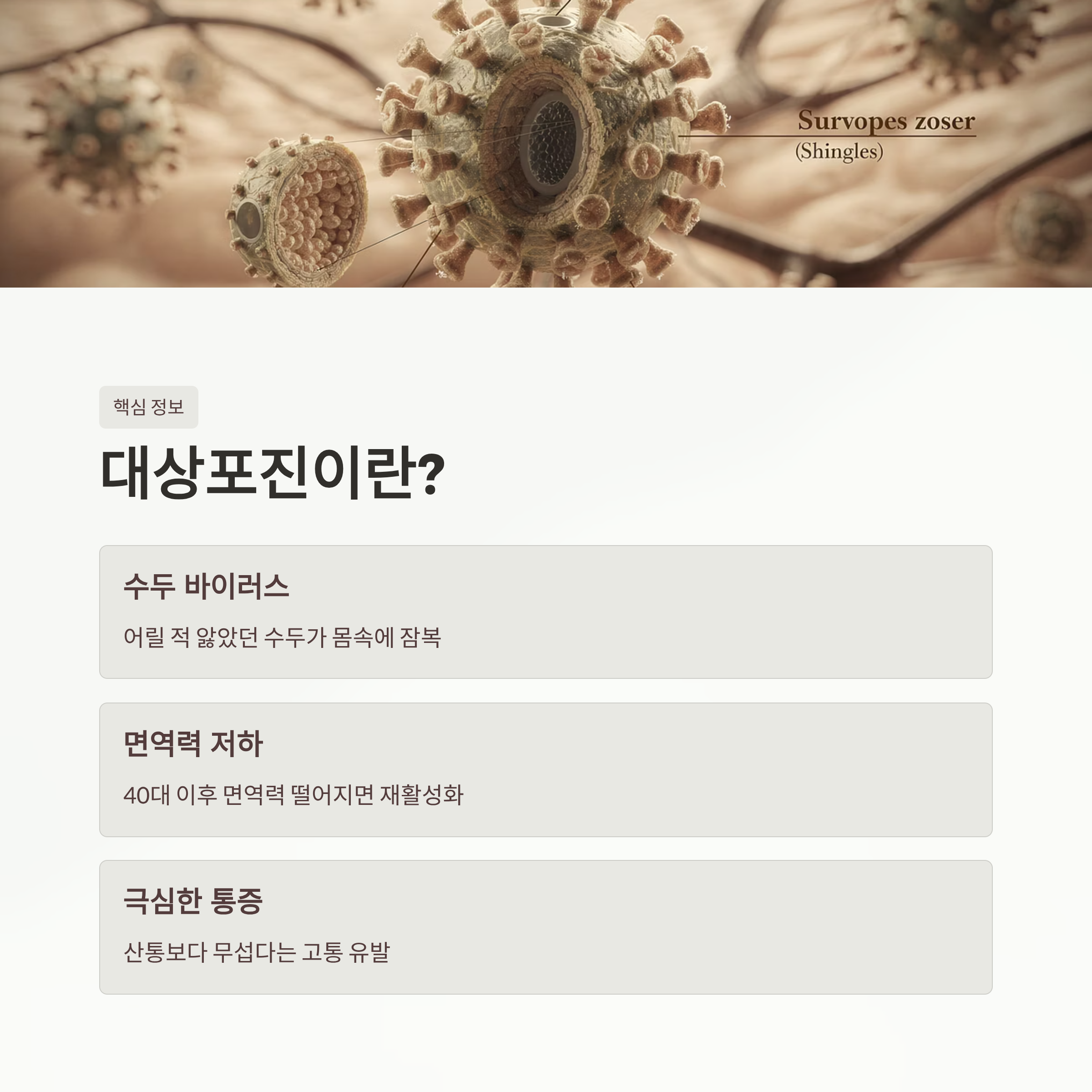 면역력이 떨어지는 40대 이후부터 고개를 들어 극심한 통증을 유발합니다.