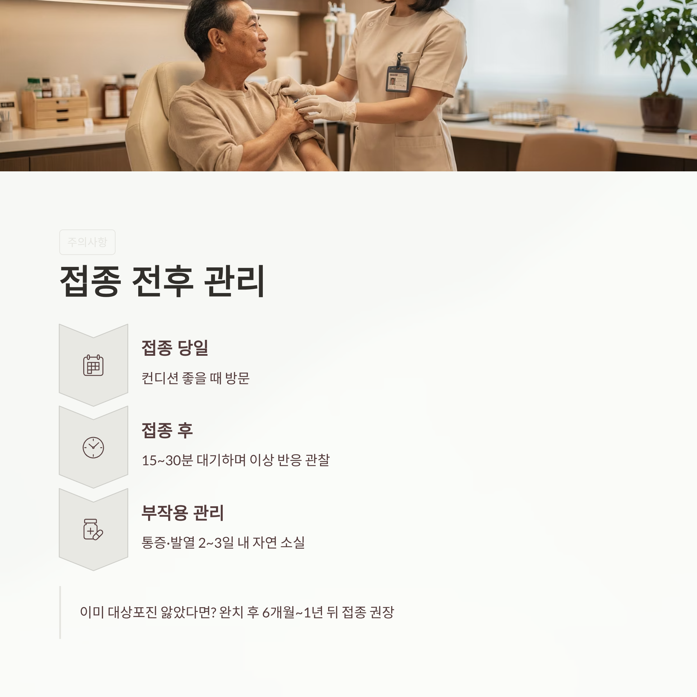 백신을 맞는 것만큼 중요한 것이 바로 사후 관리와 컨디션 조절입니다.