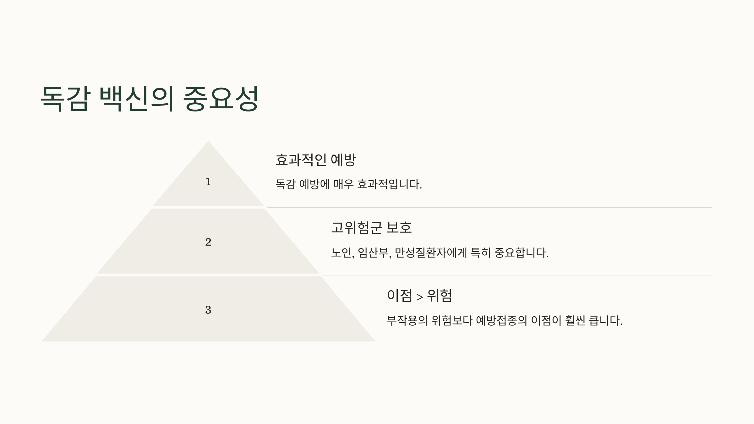 독감 백신은 독감 예방에 매우 효과적입니다. 특히 노인, 임산부, 만성질환자 등 고위험군에게는 매우 중요합니다. 부작용의 위험보다 예방접종의 이점이 훨씬 크므로, 특별한 금기사항이 없다면 접종을 권장합니다 [6].