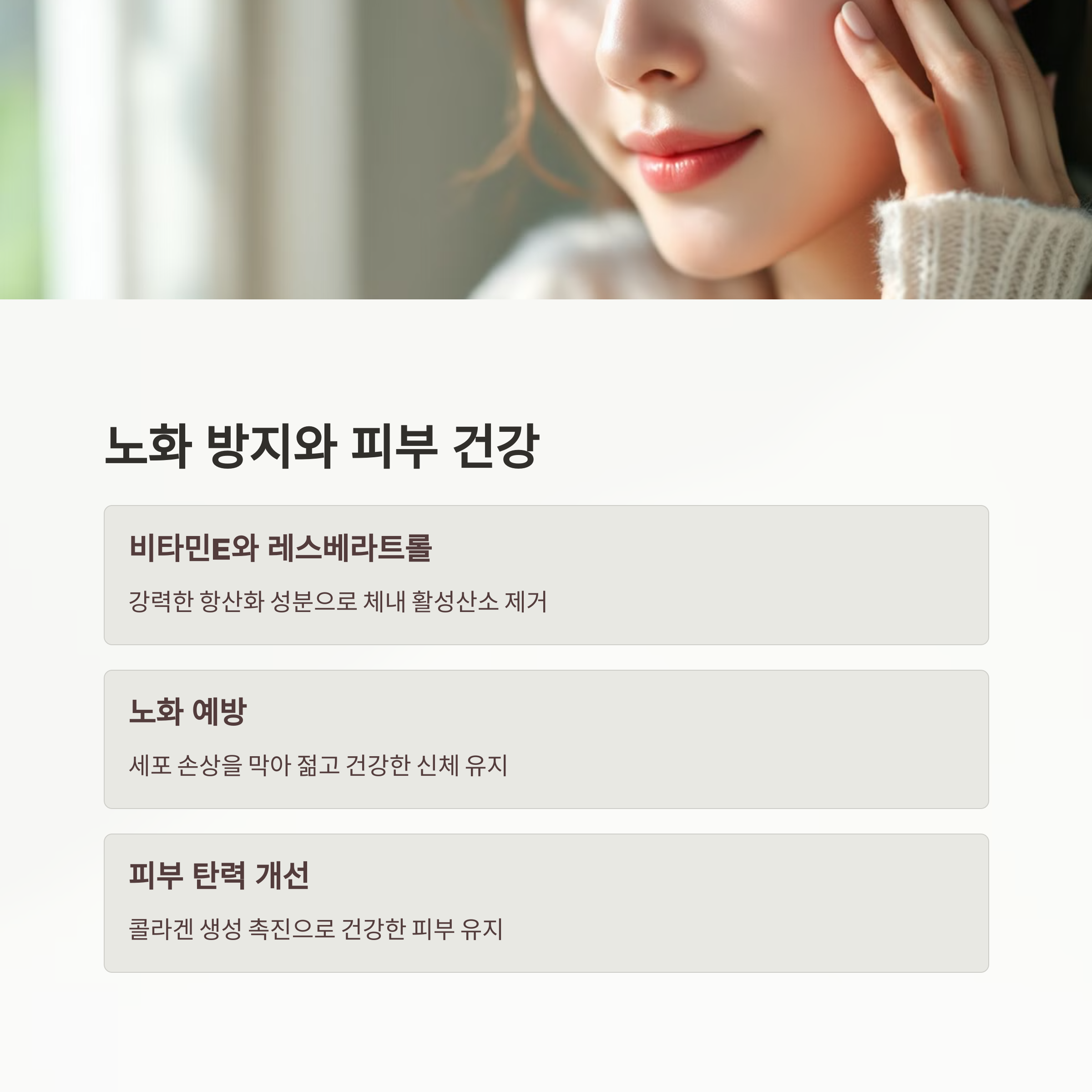 또한 땅콩의 붉은 속껍질에는 적포도주에 있는 항산화물질인 레스베라트롤이 풍부하게 들어있어 노화 방지에 효과적입니다[2][7].