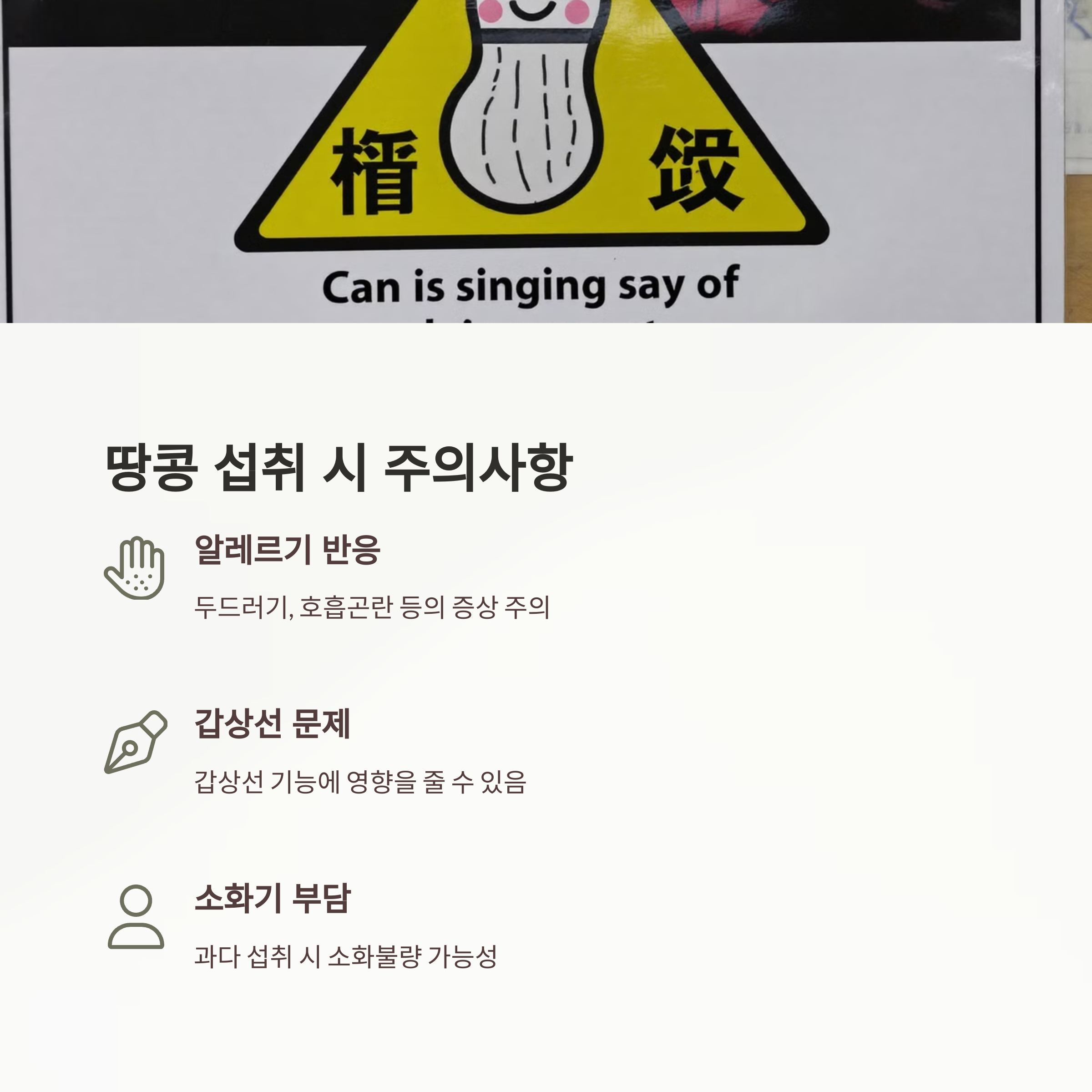 땅콩의 붉은 껍질에는 '아라키도시드'가 함유되어 있어 갑상선 문제를 일으킬 수 있습니다[3][5]. 갑상선염이나 갑상선종대가 있는 분들은 반드시 껍질을 벗겨내고 섭취하거나, 섭취를 자제하는 것이 좋습니다.
