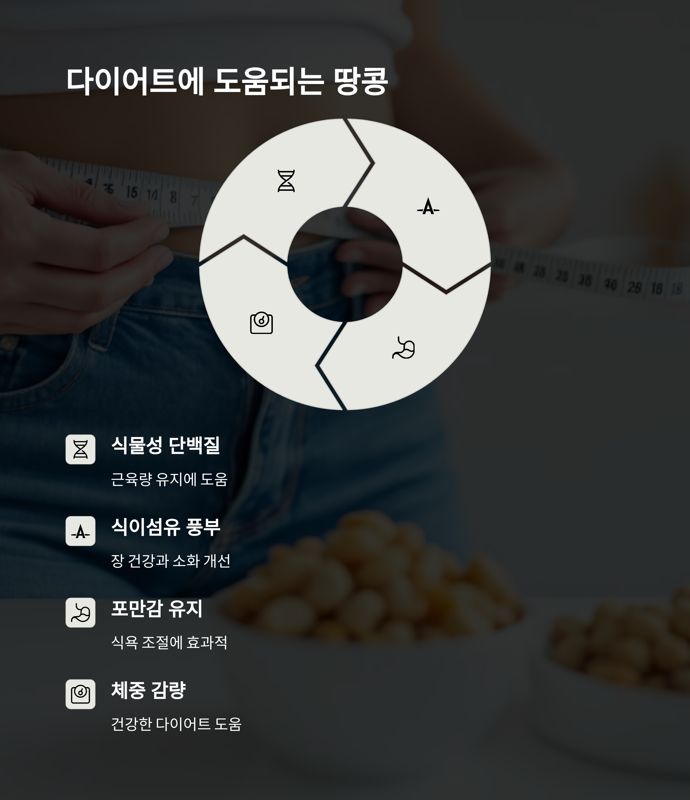 땅콩의 불포화지방산은 체내 지방을 제거하는 데 도움을 주는 '좋은 기름'이라 다이어트에 효과적입니다[5].