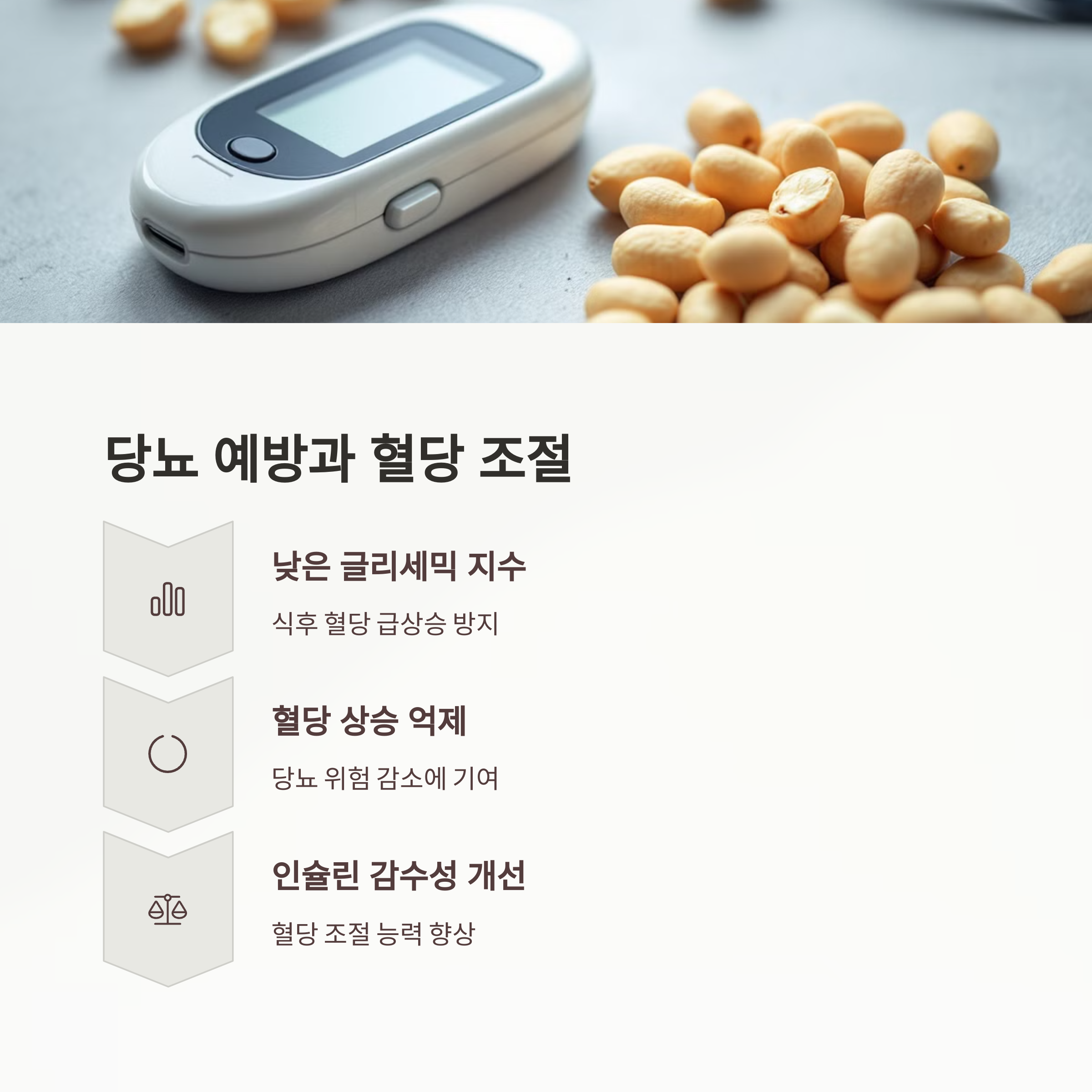 땅콩은 글리세믹 지수가 낮은 식품으로 혈당 상승을 억제하는 효과가 있습니다[2]. 인슐린의 항상성을 개선하는 효능이 있어 당뇨병 예방과 개선에 도움을 줍니다[5]. 식후에 땅콩을 조금씩 섭취하면 혈당 관리에 효과적이죠.