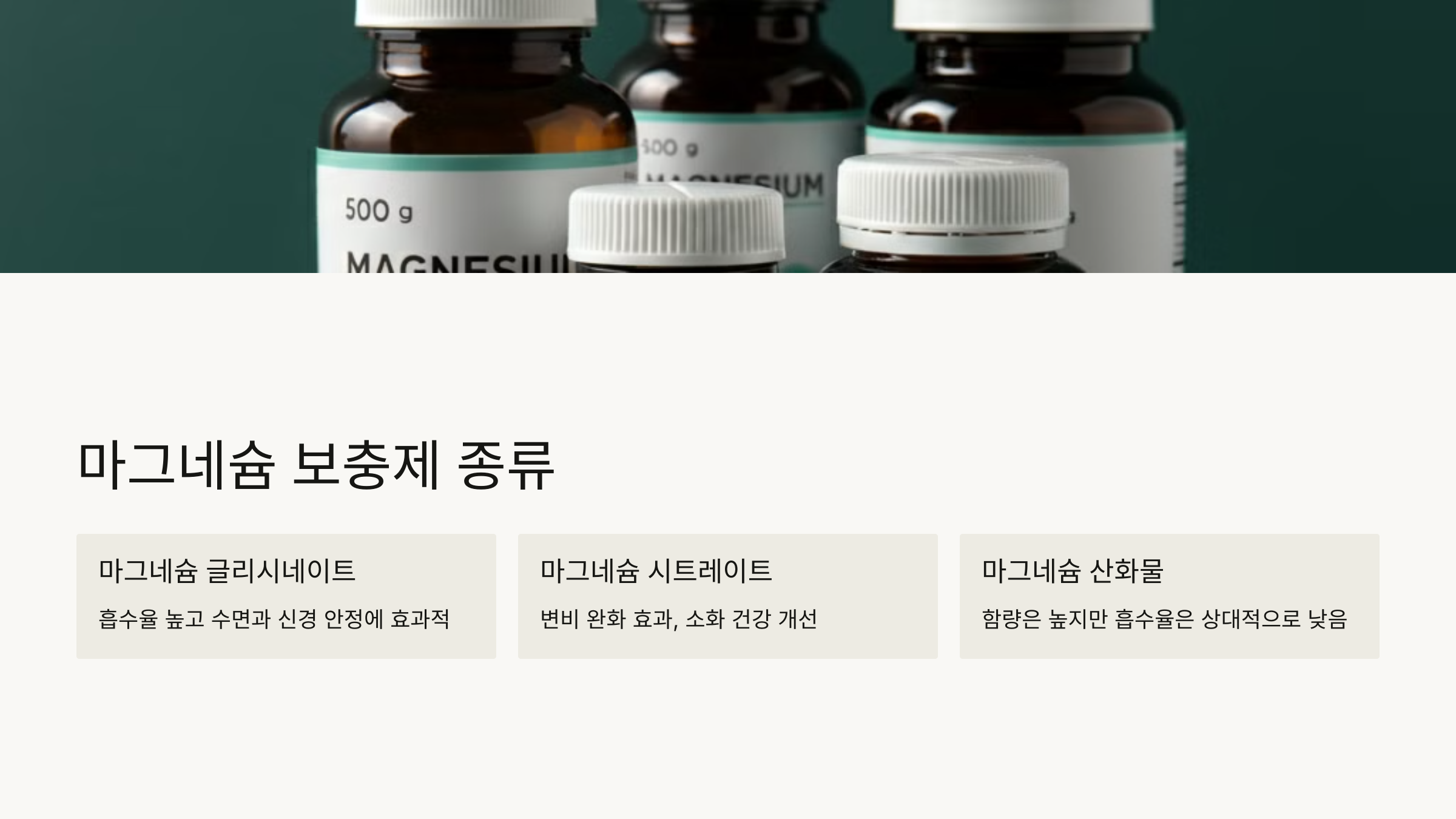 - 마그네슘 글리시네이트: 흡수율이 높고, 수면과 신경 안정에 효과적입니다.
