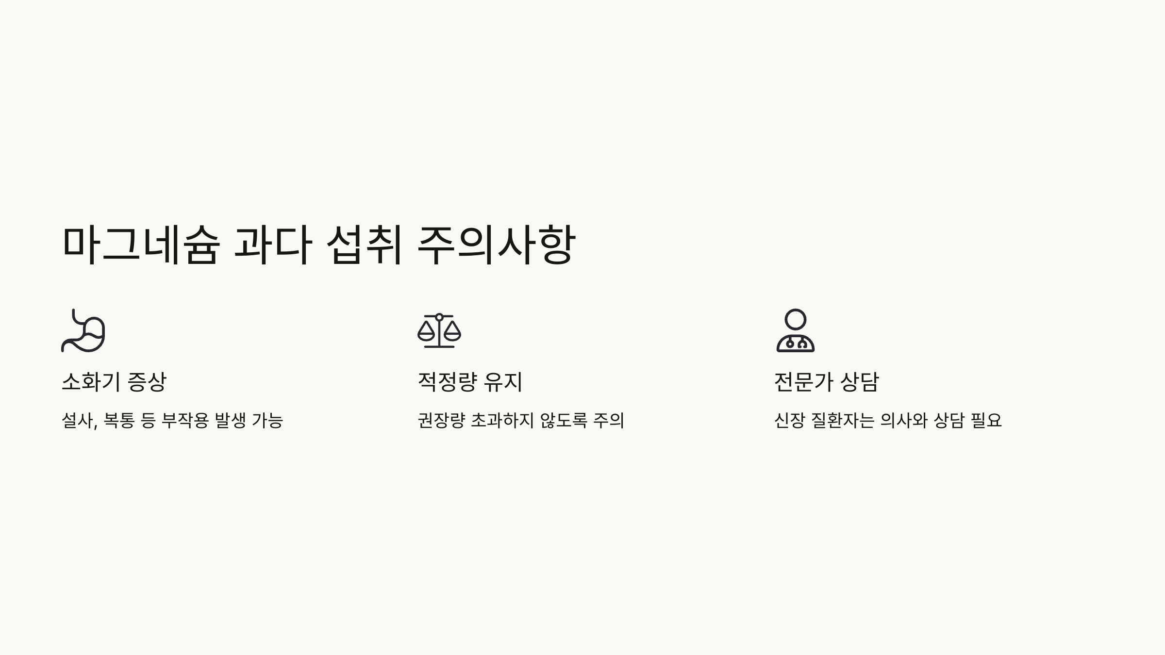 마그네슘 보충제는 대체로 안전하지만, 신장 질환이 있는 경우 섭취 전에 반드시 의사와 상담하세요.