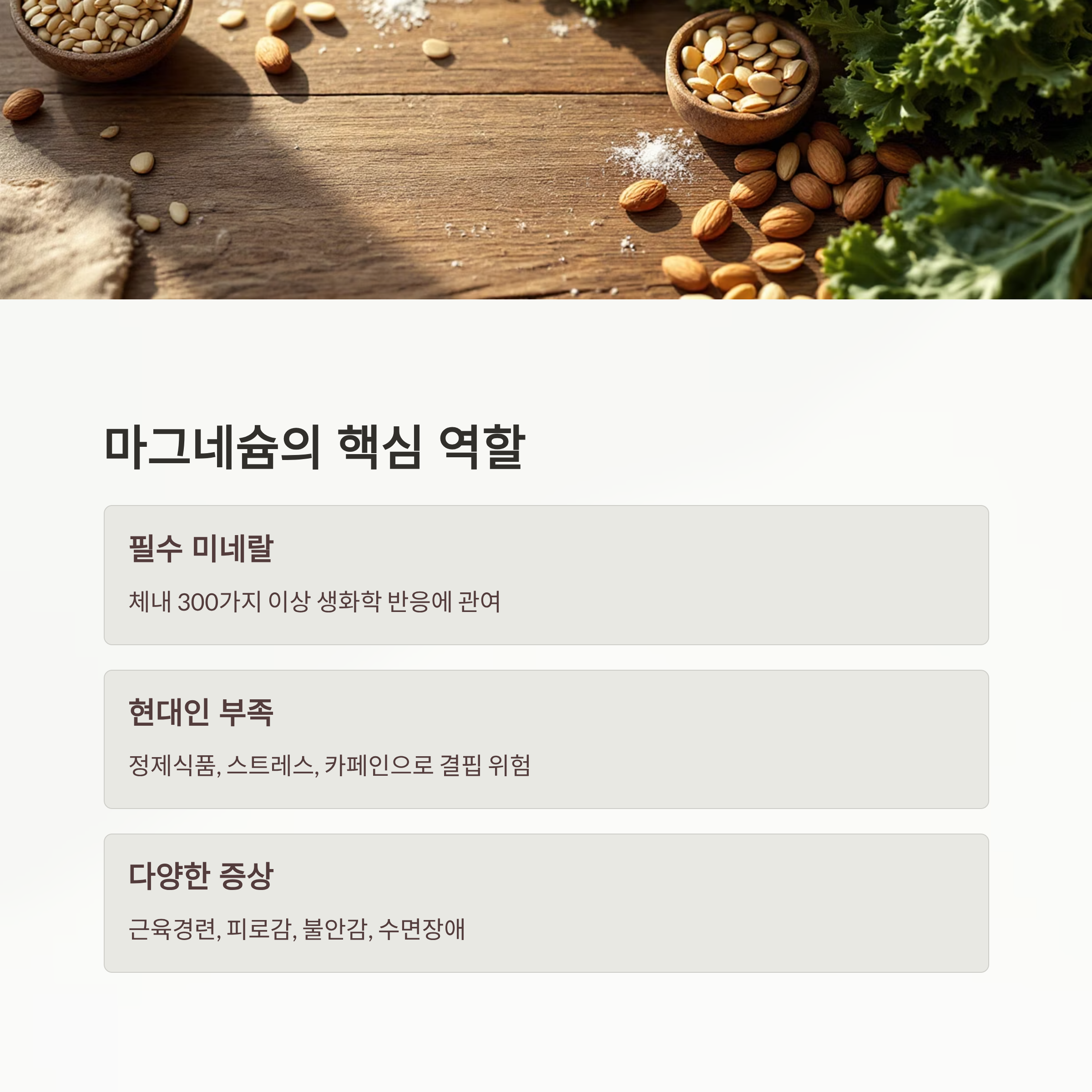 특히 현대인들은 정제된 식품 섭취 증가와 스트레스, 과도한 카페인 섭취로 인해 마그네슘 결핍에 쉽게 노출될 수 있어요.