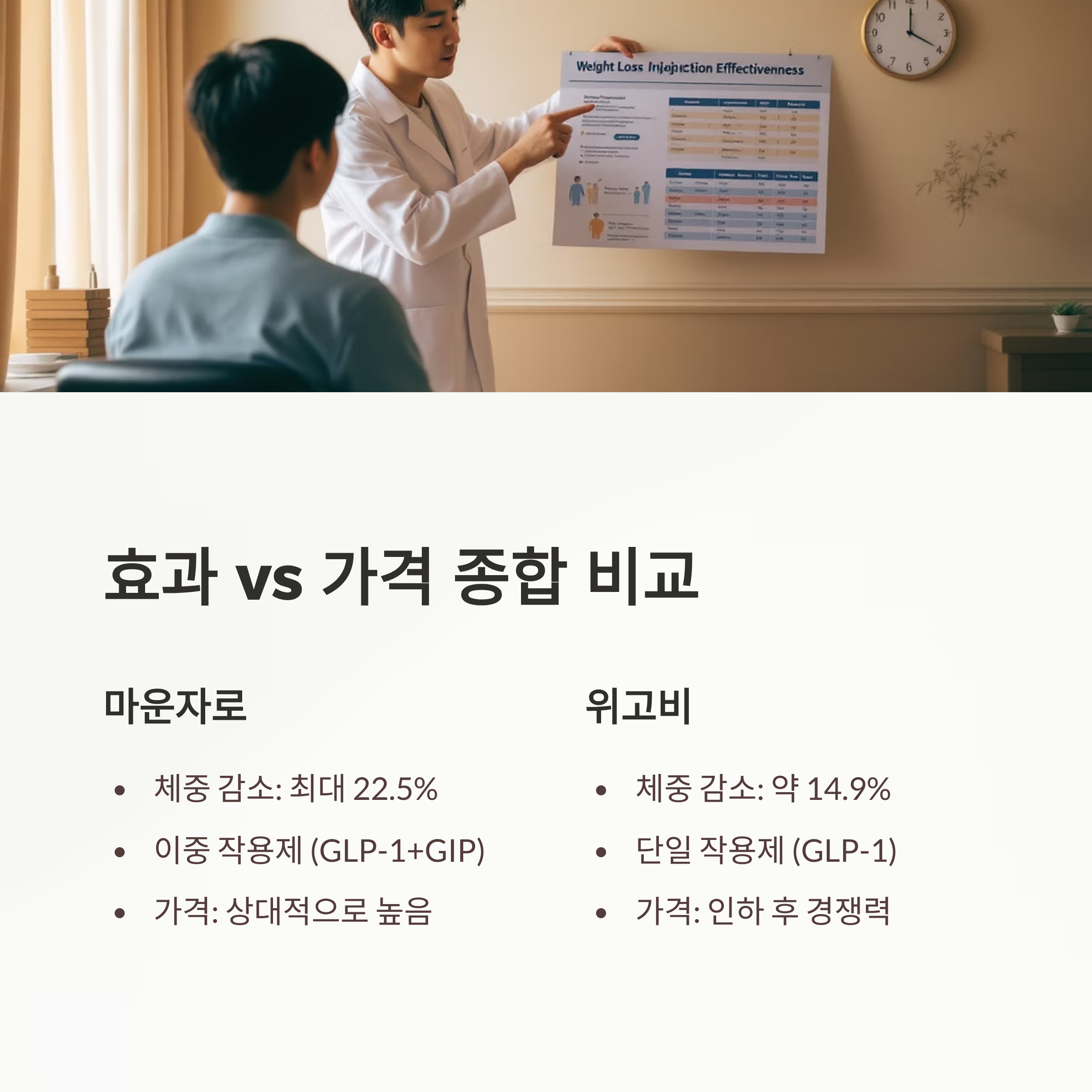 마운자로의 체중 감량 효과가 약 7.6%포인트 더 높다는 점을 고려하면, 단순 가격 비교만으로는 판단하기 어려워요.