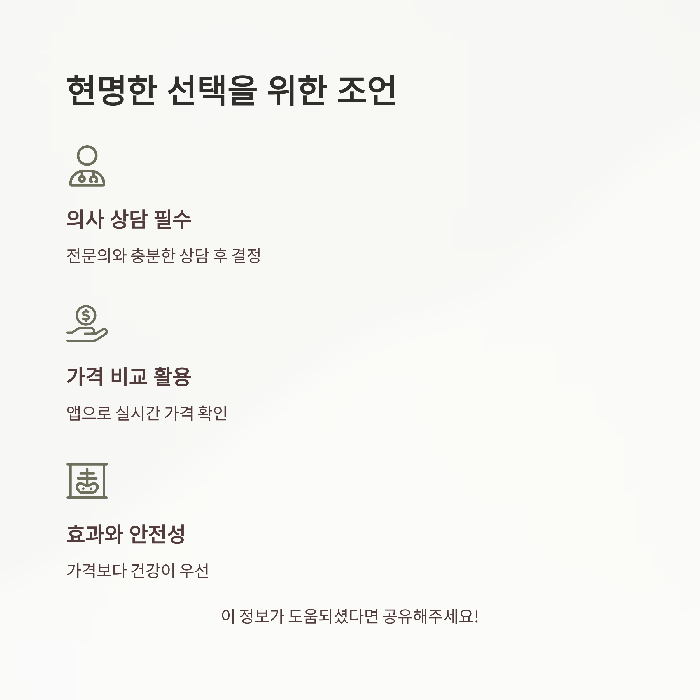 무엇보다 이런 약물은 의사의 처방과 지속적인 모니터링이 필요한 전문의약품이에요. 가격도 중요하지만 안전하고 효과적인 치료를 위해서는 신뢰할 수 있는 의료진과 상담하시길 바랍니다.
