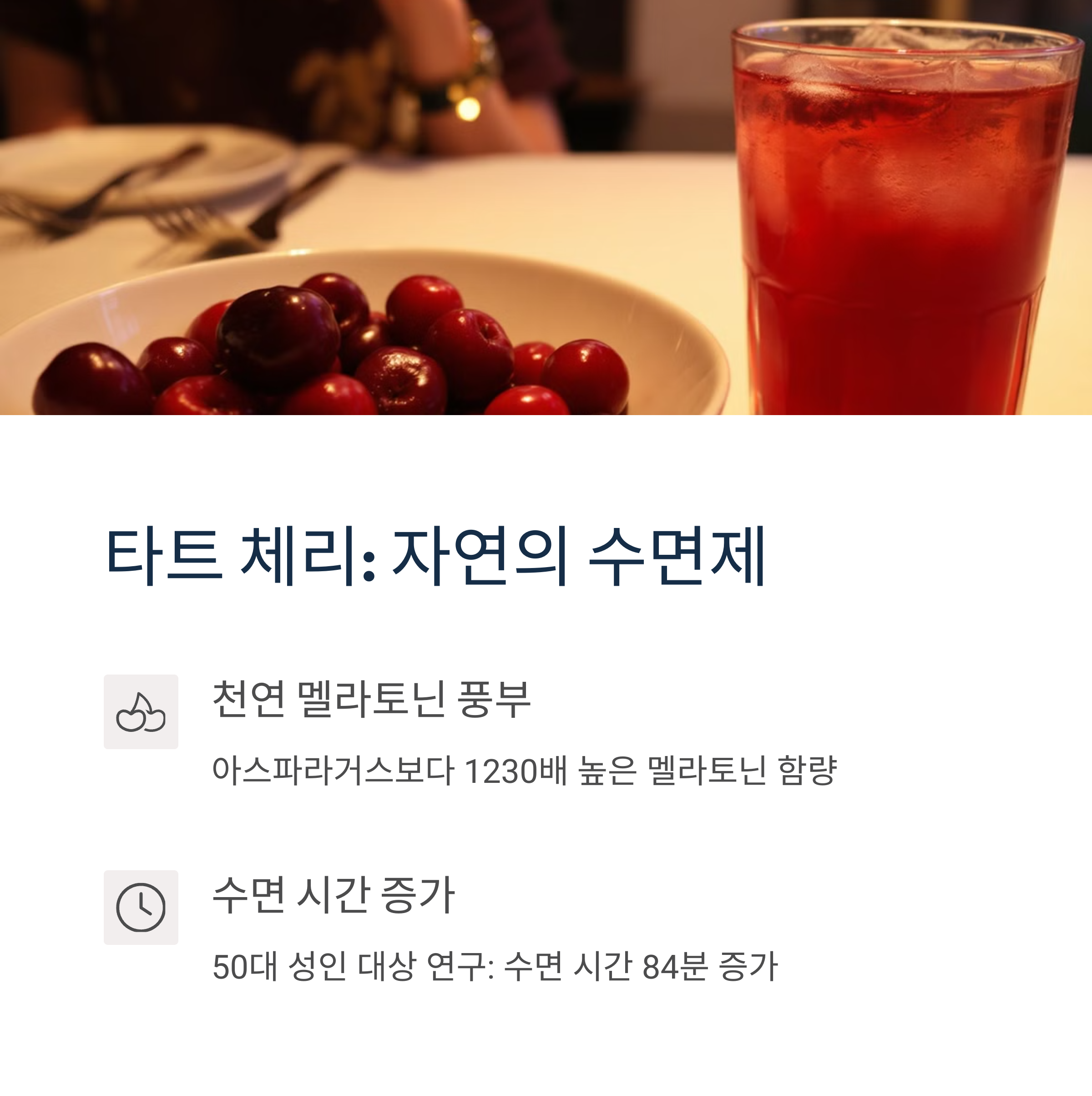 타트 체리는 천연 멜라토닌의 보고라고 할 수 있어요! 일반 체리보다 훨씬 많은 양의 멜라토닌을 함유하고 있어 수면의 질을 개선하는 데 탁월한 효과를 보입니다.