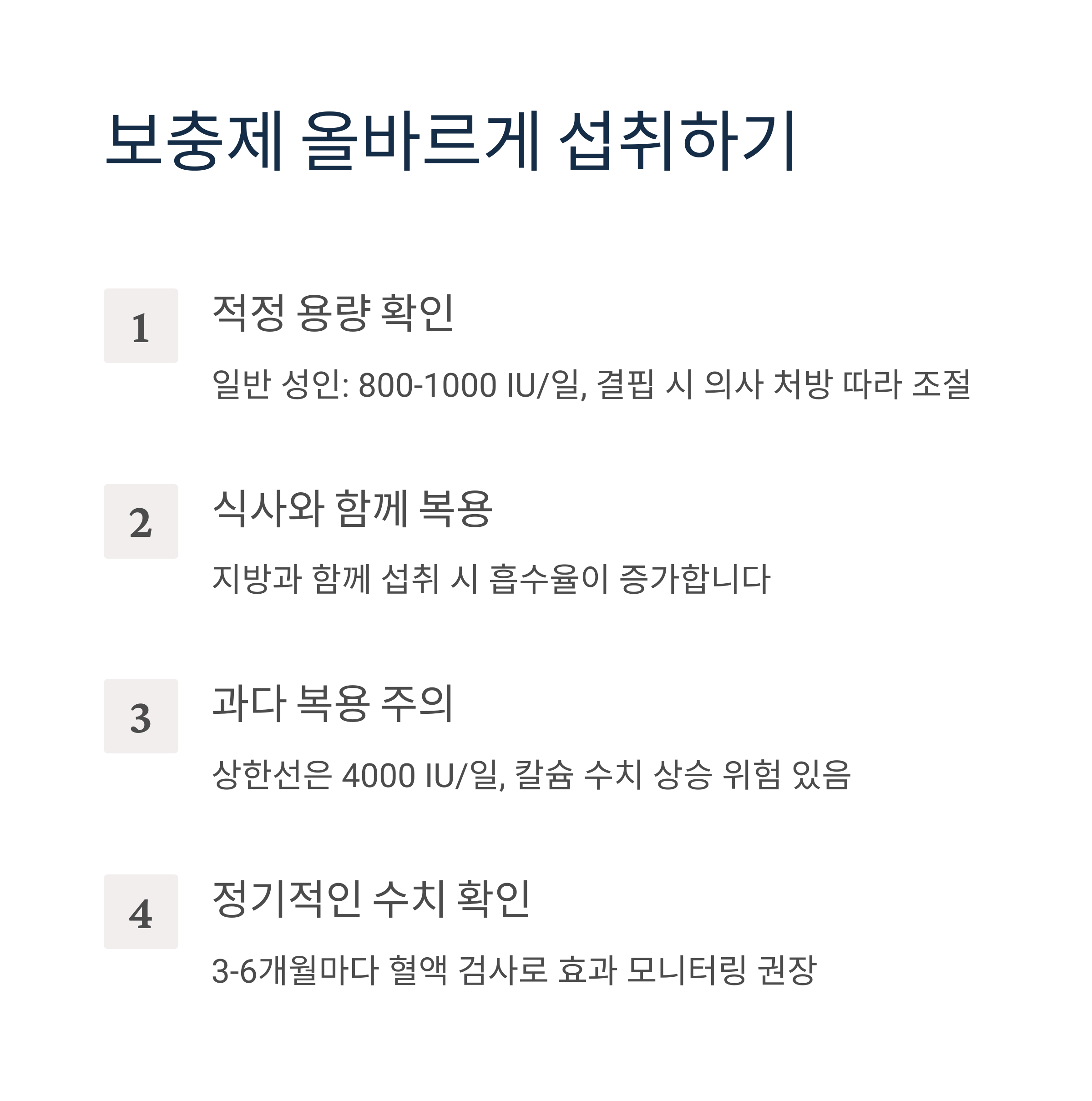 - 과량 복용 주의: 하루 100µg/일 이상 섭취하면 고칼슘혈증 등의 부작용이 생길 수 있으므로 주의해야 합니다
