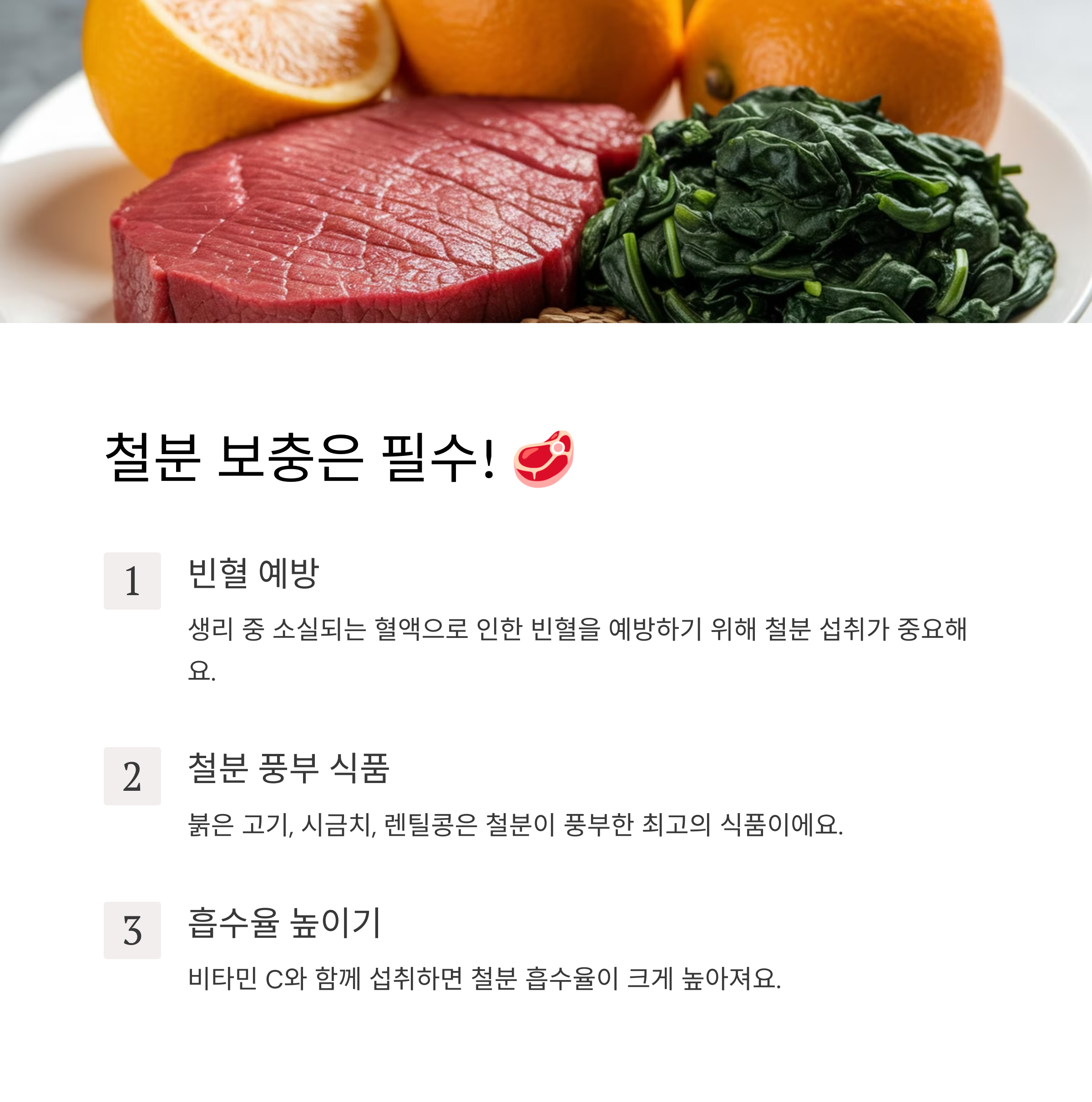 생리하면서 철분이 빠져나가니까 철분이 많은 음식도 꼭 먹어줘야 해요!