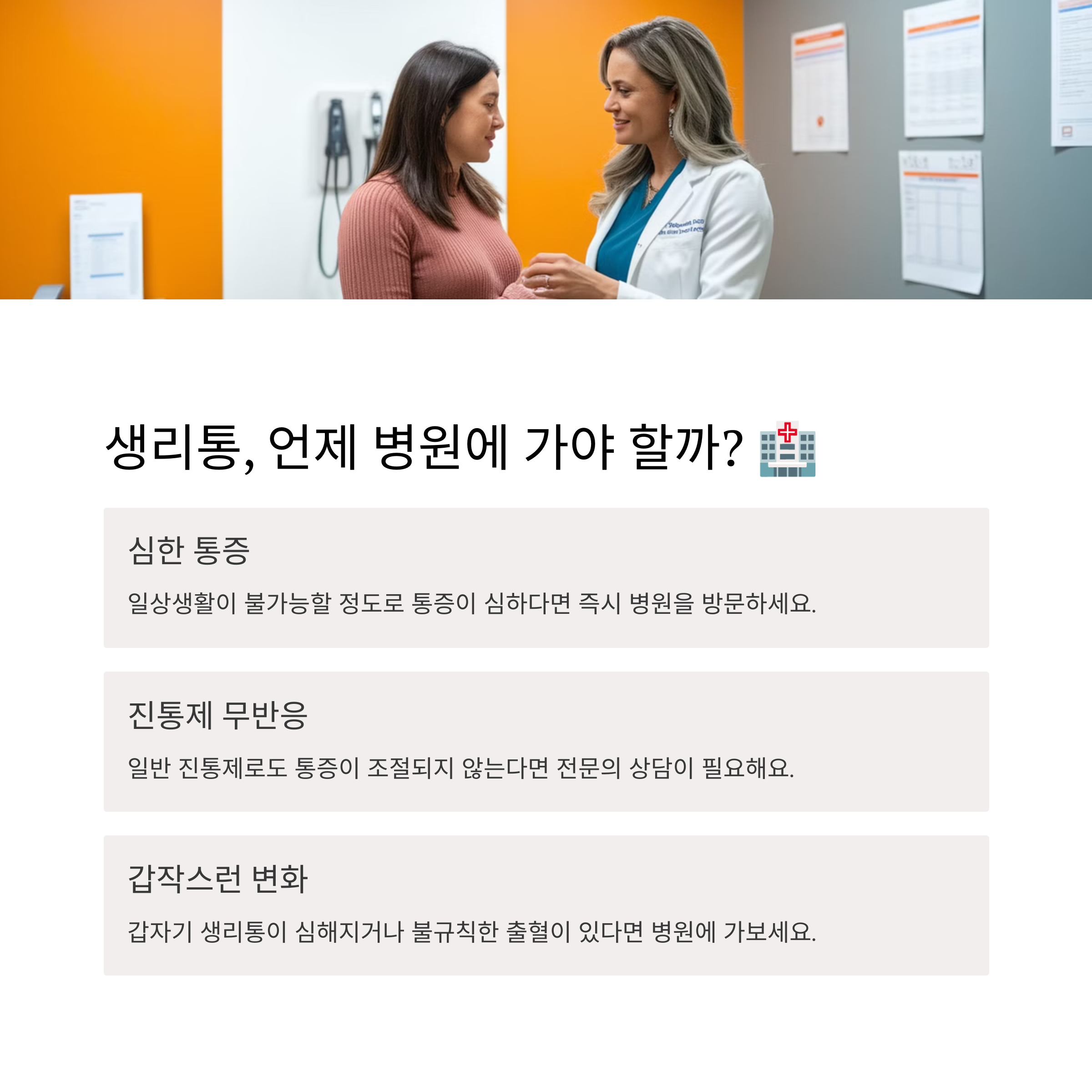 👉 평소보다 훨씬 심하게 아프거나, 진통제를 먹어도 효과가 없다면 병원 진료를 받아보는 게 좋아요!