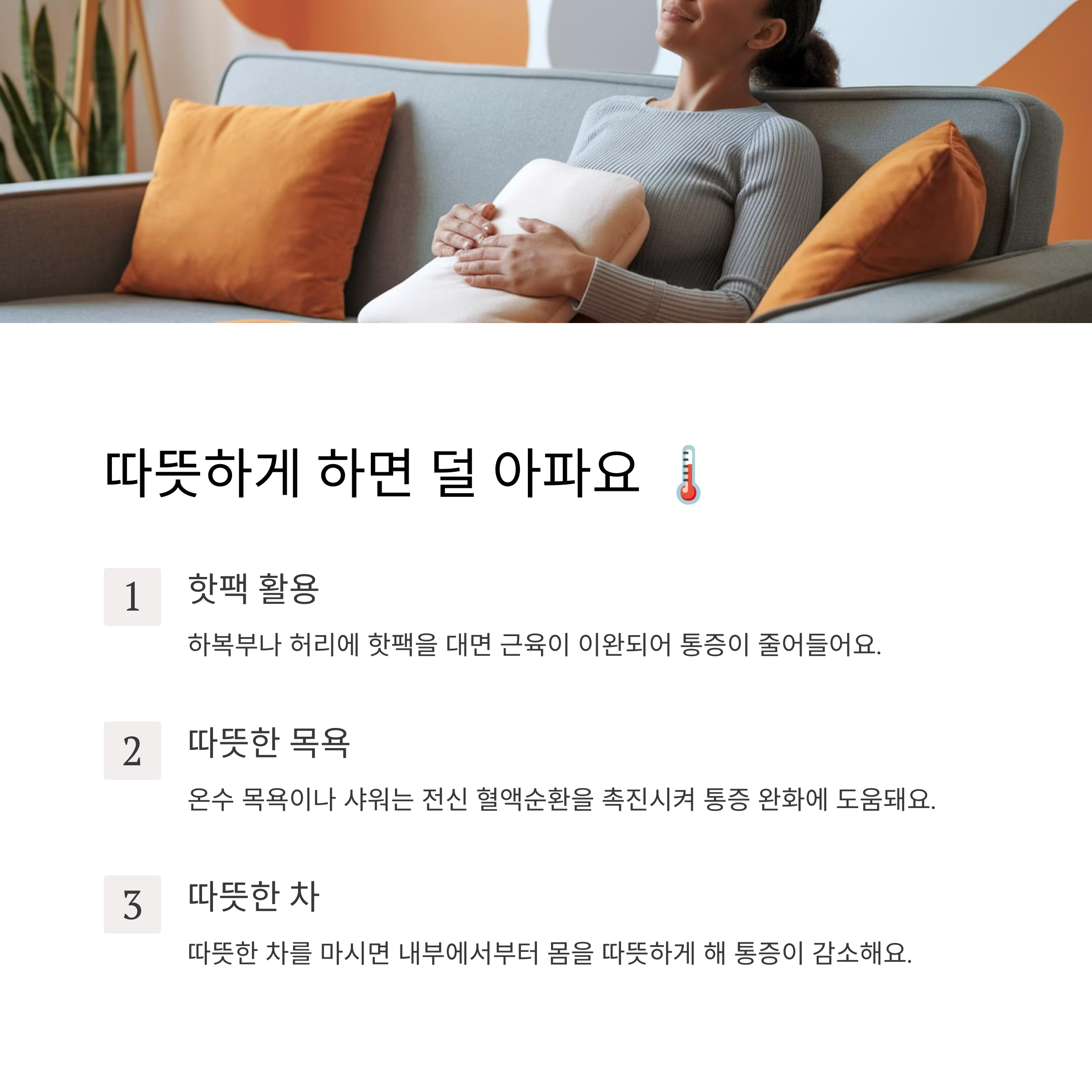 생리통이 심할 때는 몸을 따뜻하게 하고, 좋은 음식을 먹고, 가볍게 움직이는 것만으로도 훨씬 나아질 수 있어요.