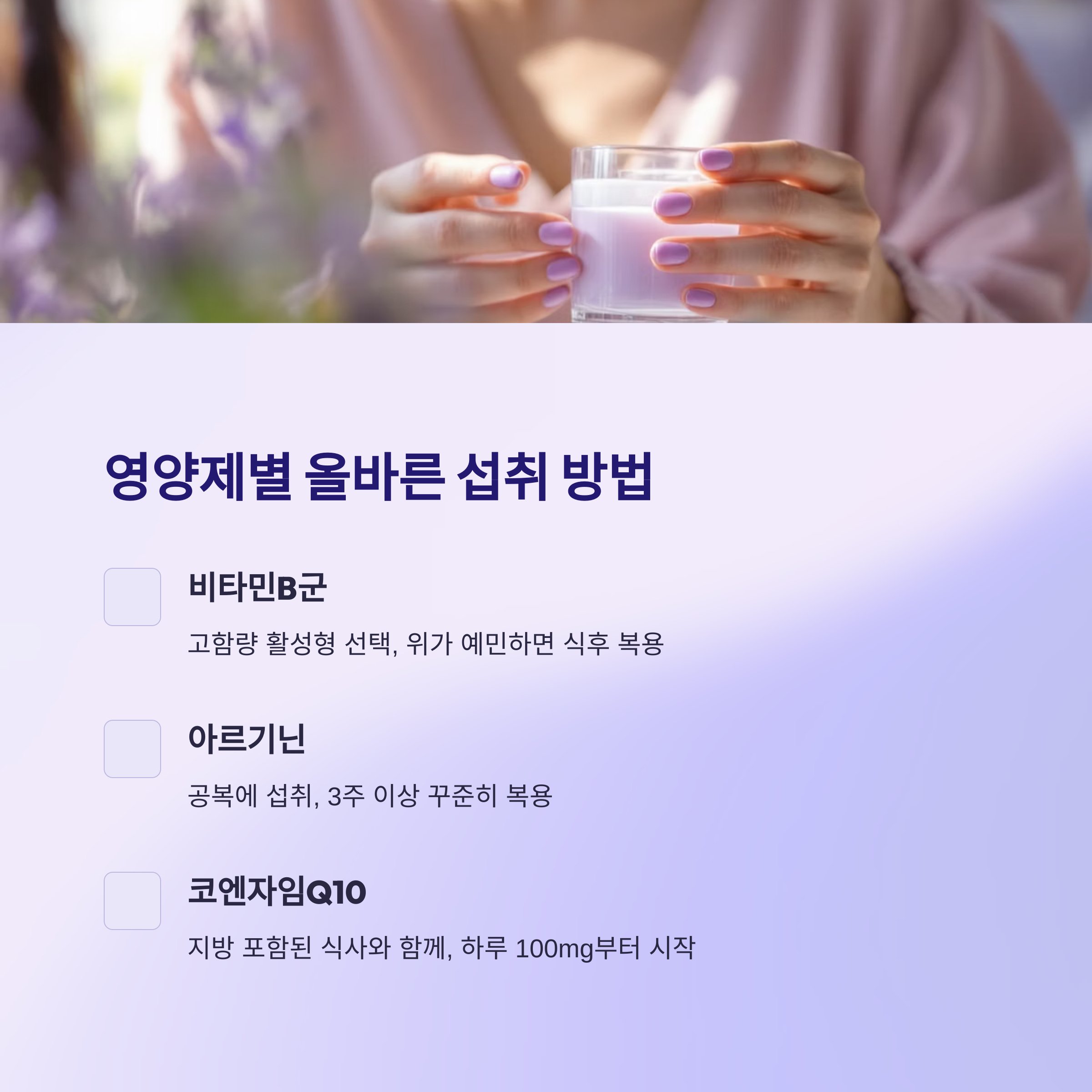 - 코엔자임 Q10: 지용성이므로 아침 식사와 함께 섭취하면 흡수율 증가