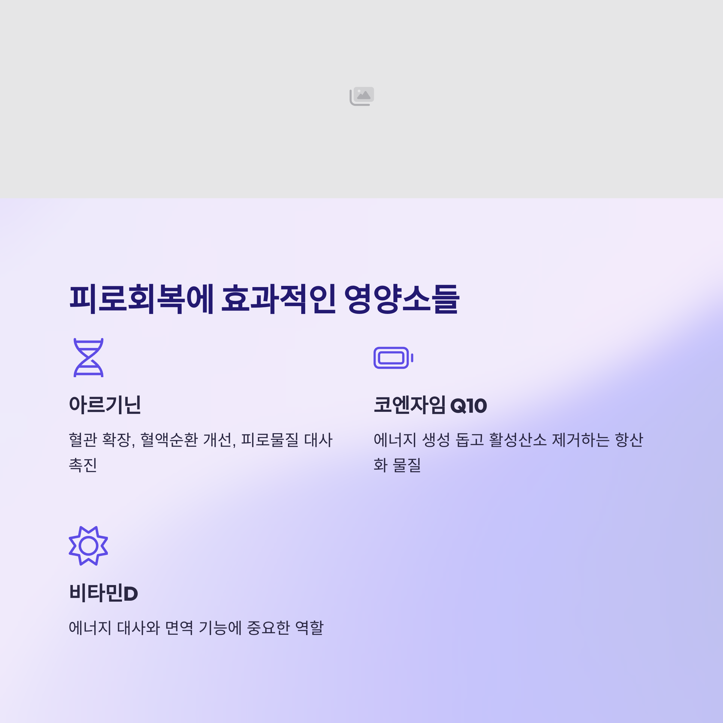 코엔자임 Q10(코큐텐)은 체내 에너지 생성을 돕고 활성산소를 제거하는 강력한 항산화 물질이에요. 우리 몸의 모든 세포에서 에너지를 만드는 과정에 참여하기 때문에 피로 회복에 효과적이랍니다.