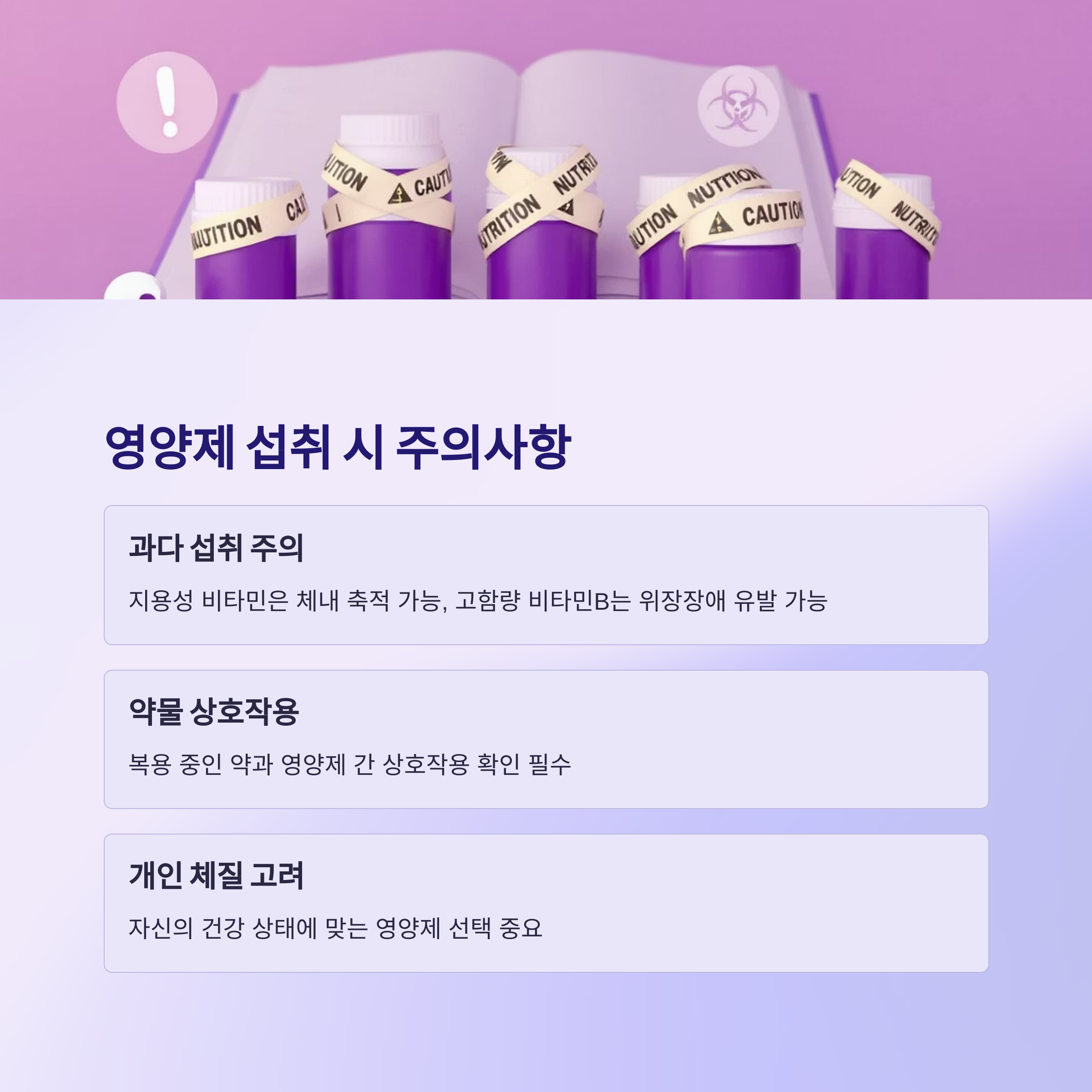 영양제도 과하면 독이 될 수 있어요. 특히 지용성 비타민(비타민A, D, E, K)은 체내에 축적될 수 있어 과다 섭취 시 부작용이 생길 수 있어요.