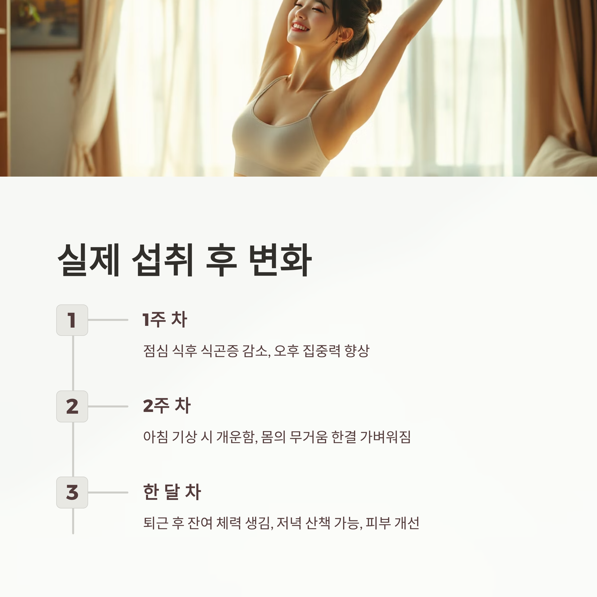 - 2주 차: 아침에 알람 소리를 듣고 일어날 때 몸이 물 먹은 솜처럼 무겁던 게 한결 가벼워졌습니다. "아, 잤다!" 하는 개운함이 느껴지기 시작했습니다.
