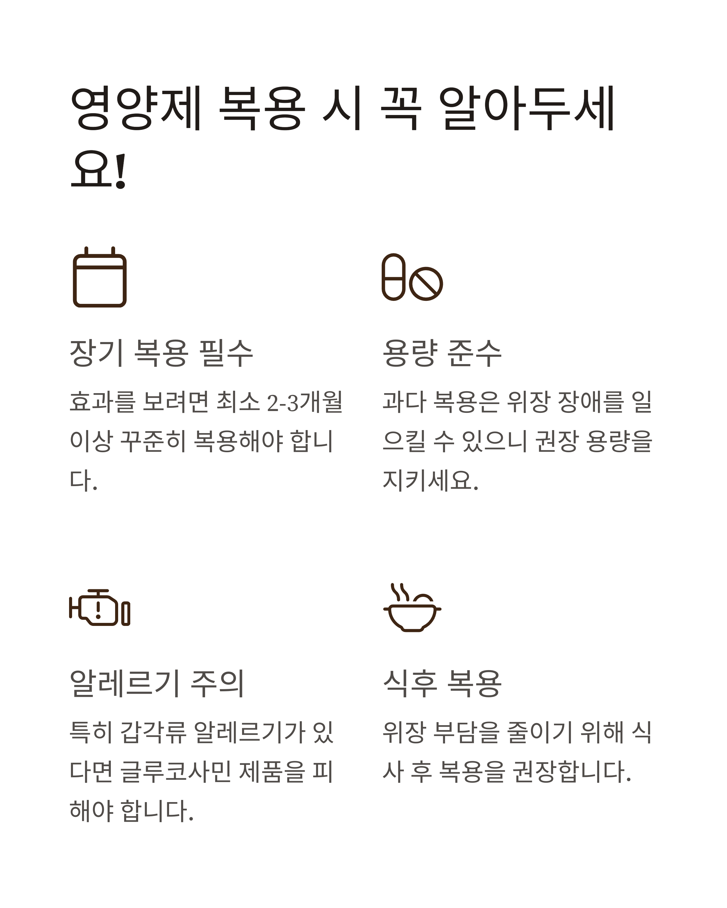 - 과다 복용은 금물 - 권장 용량을 지켜서 복용하세요. 더 많이 먹는다고 효과가 비례해서 좋아지지는 않아요!