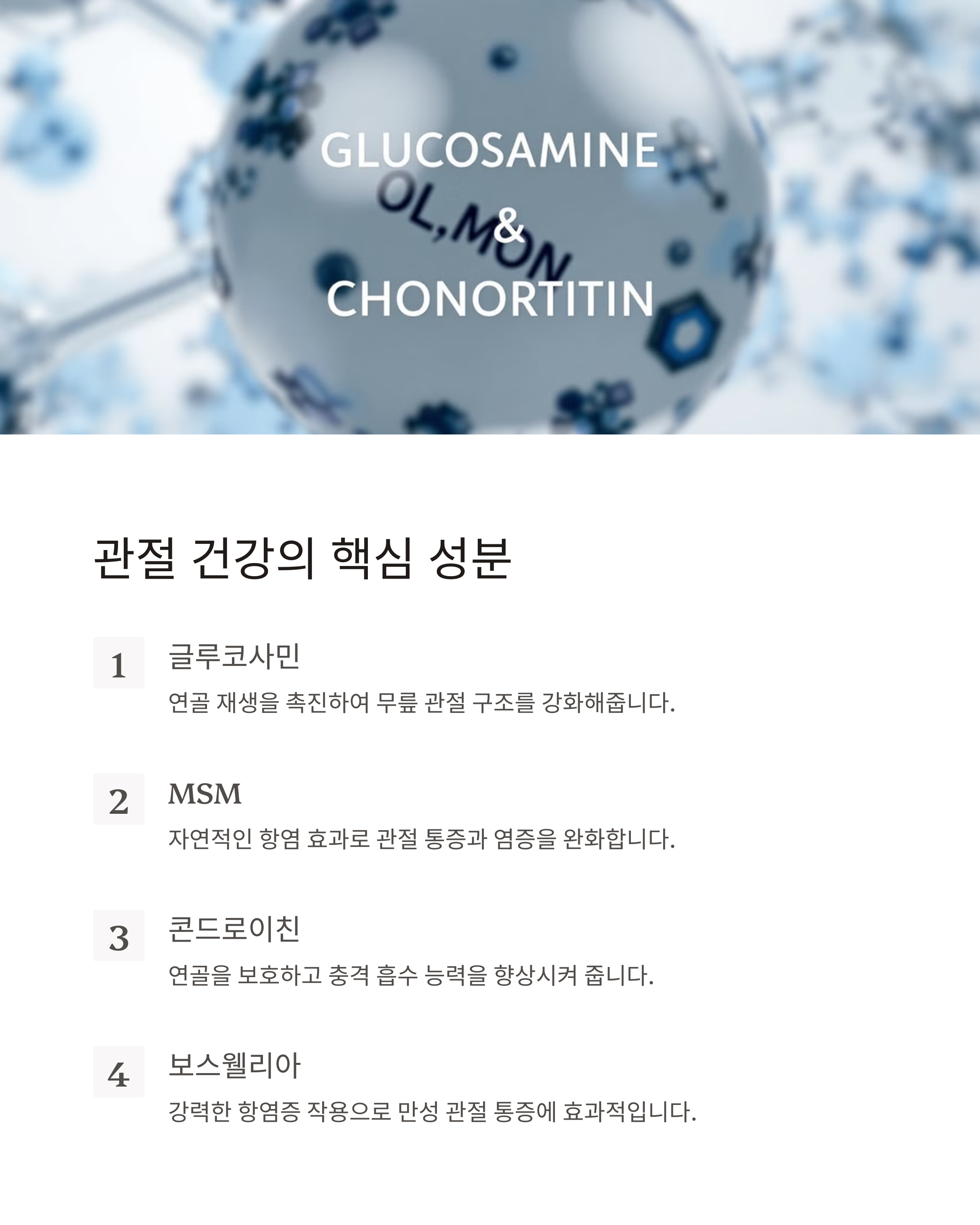 주요 성분: 글루코사민, 콘드로이틴, MSM