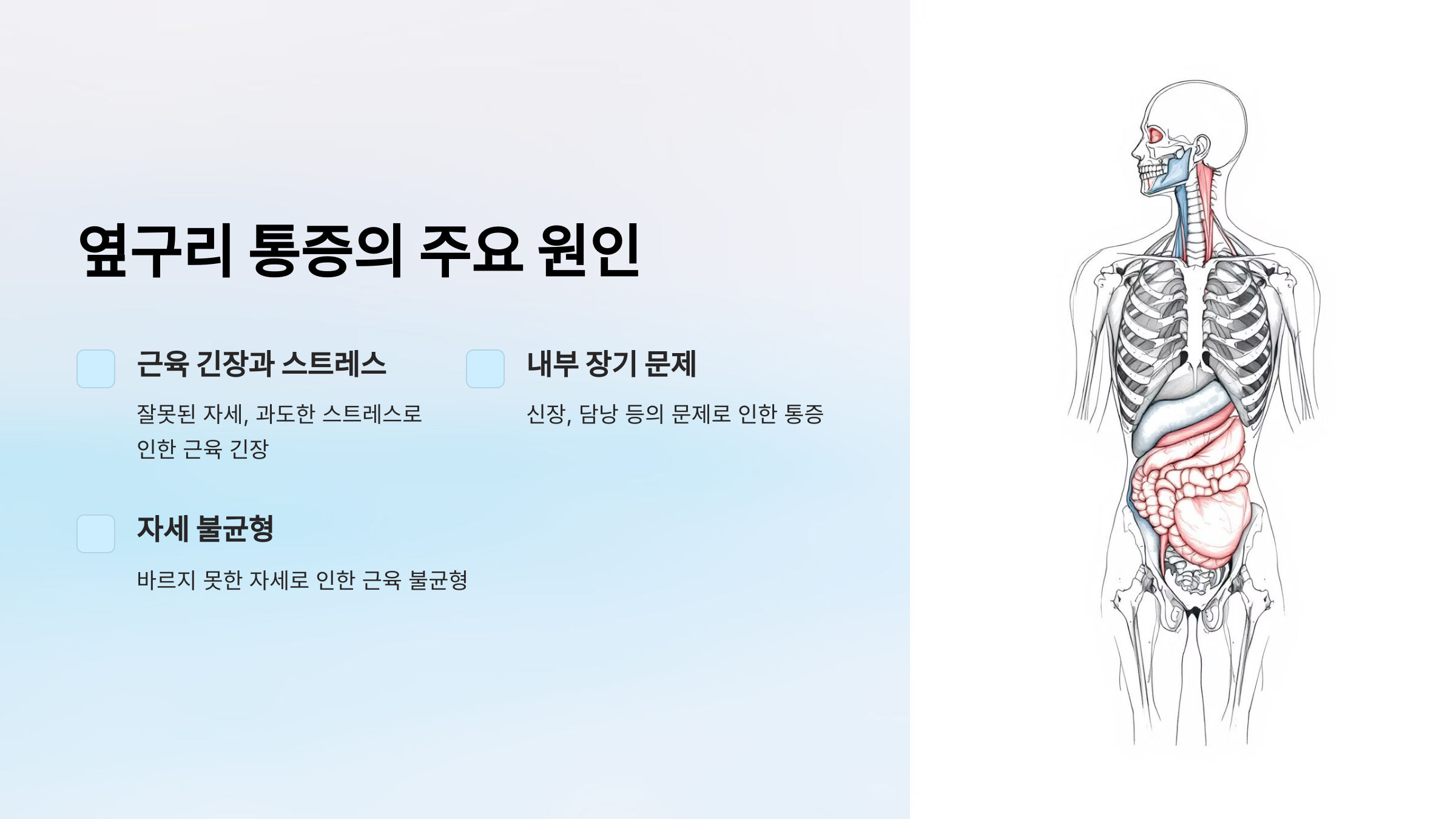 - 잘못된 자세나 과도한 스트레스로 인해 옆구리 근육이 긴장될 수 있습니다.