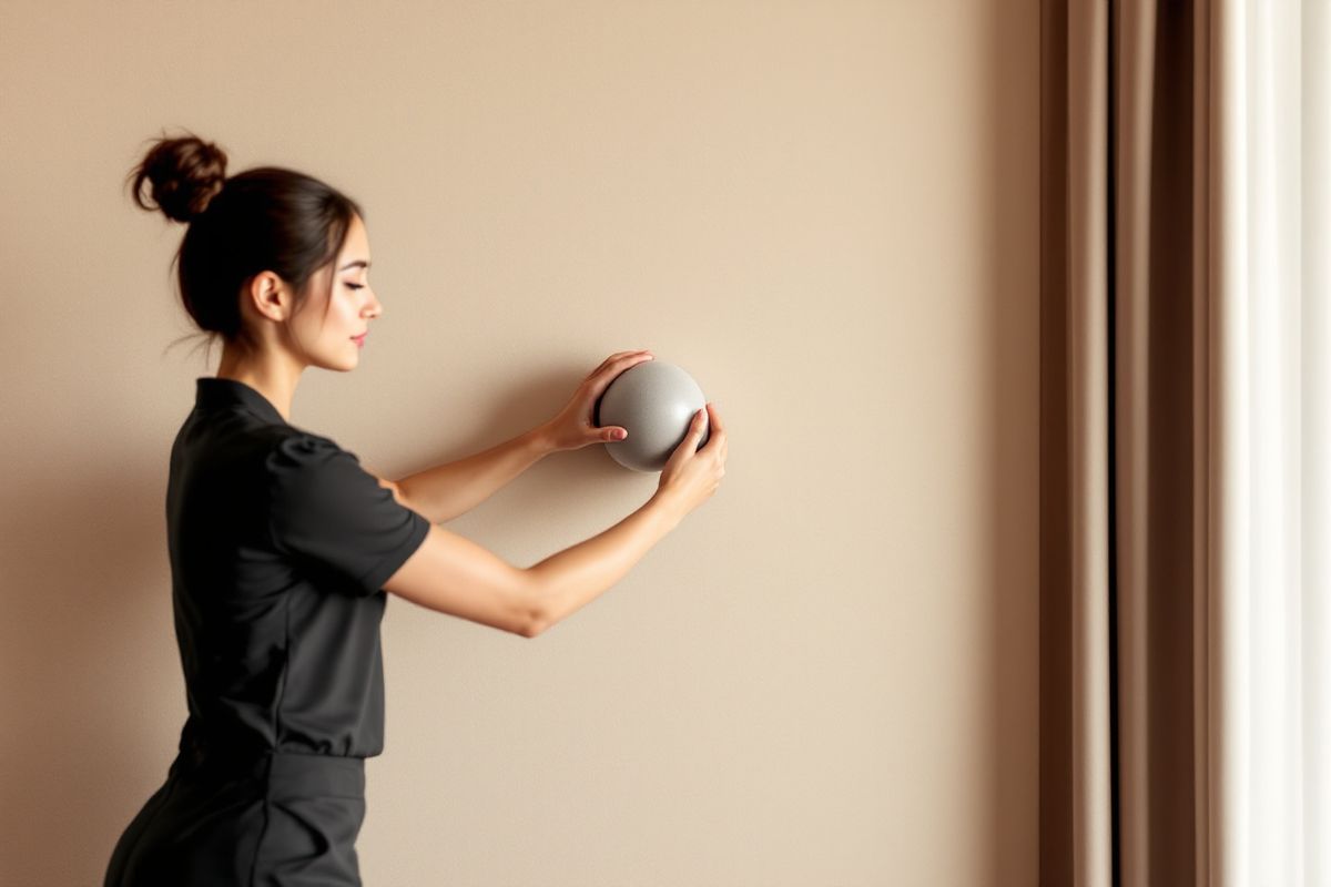 - 벽에 기대어 서서 마사지 볼을 옆구리와 벽 사이에 둡니다.