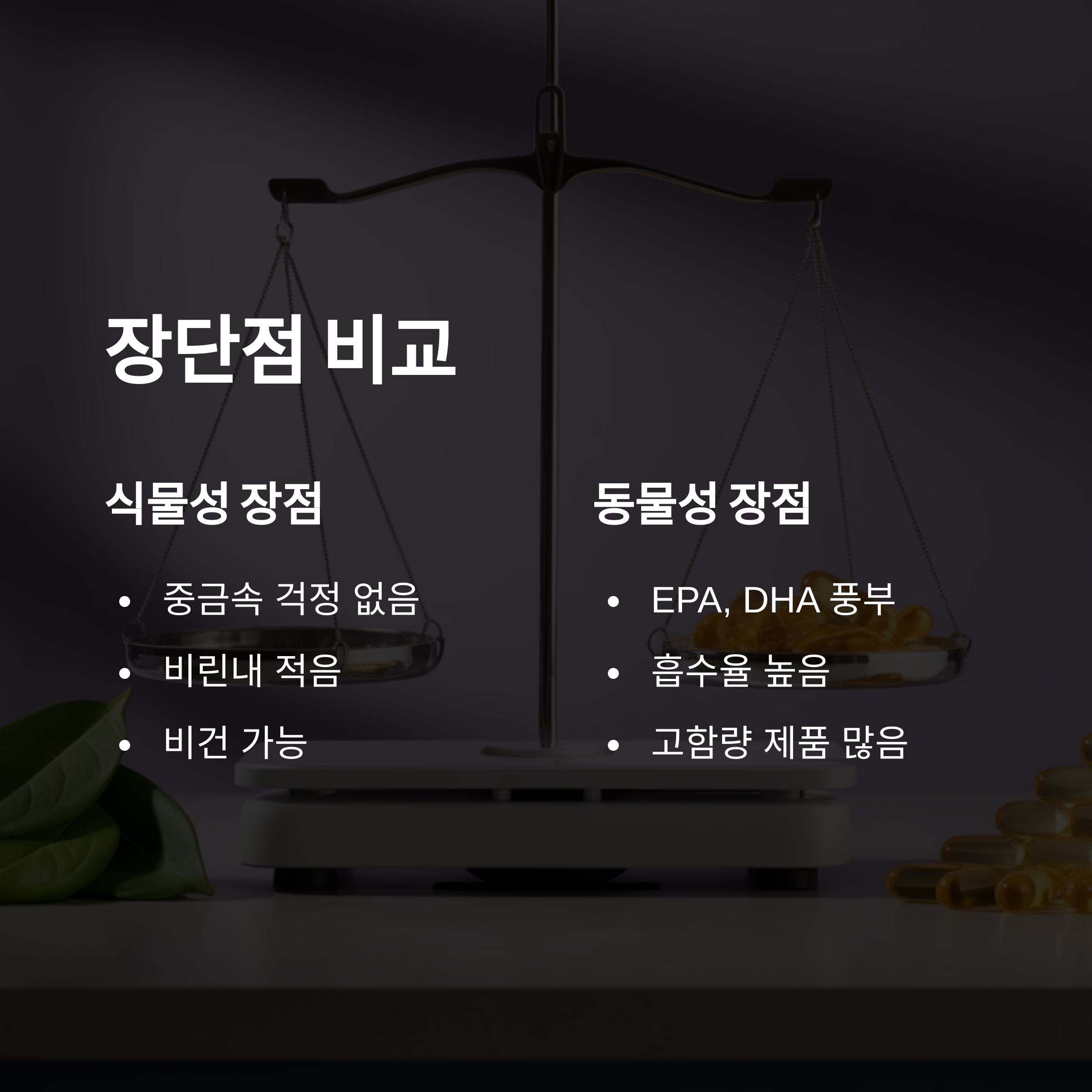 | 구분 | 식물성 오메가3 (해조류, 씨앗 등) | 동물성 오메가3 (어류) |