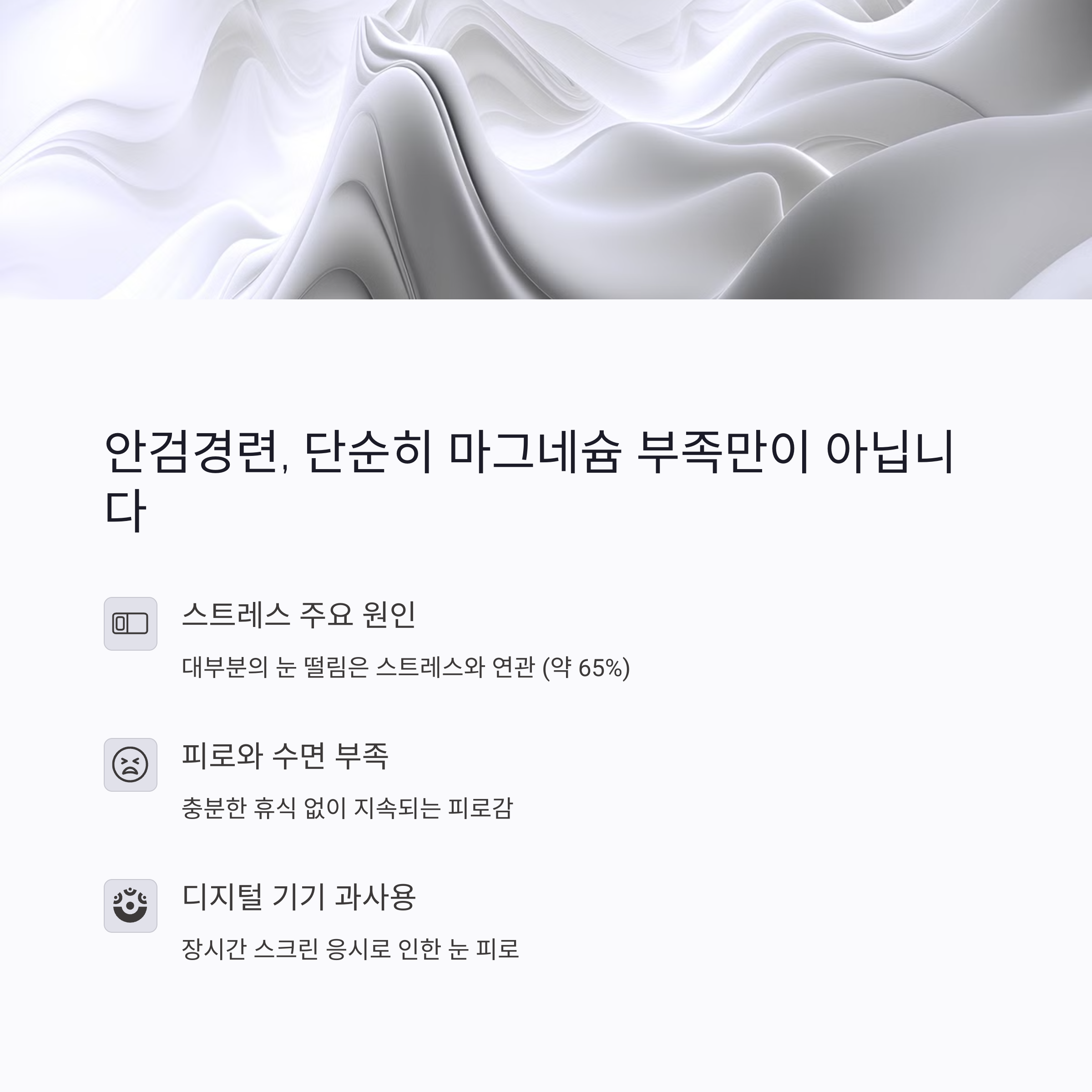 이처럼 눈 떨림은 여러 원인이 복합적으로 작용하는 경우가 많아요. 단순히 "마그네슘만 부족해서" 생기는 것이 아니라는 점, 기억해주세요!