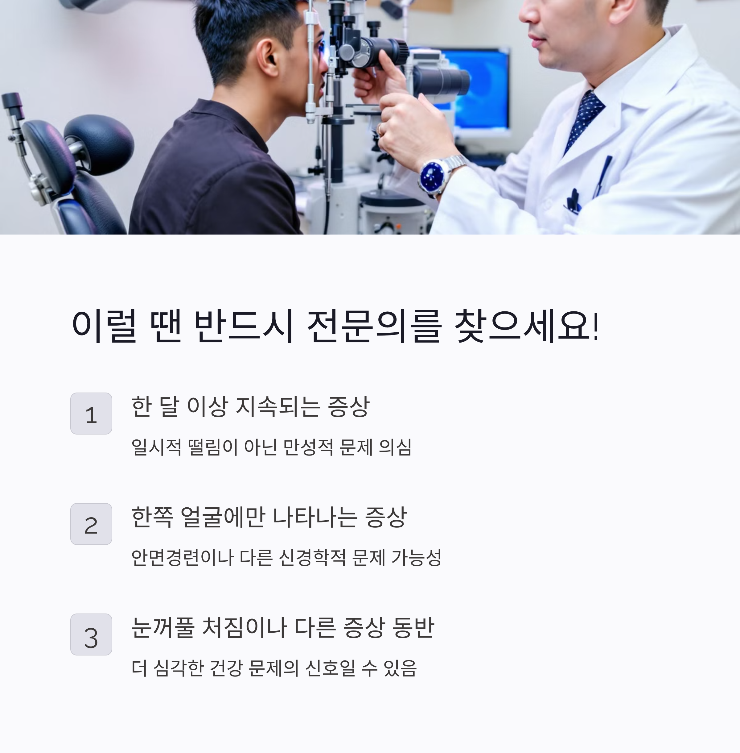 "어머, 그럼 내 증상은 어떤 건가요?" 만약 눈 떨림이 한 달 이상 지속되거나, 한쪽 얼굴에만 나타나고, 눈에서 시작해 입 주변까지 퍼진다면 안면경련을 의심해볼 필요가 있어요.