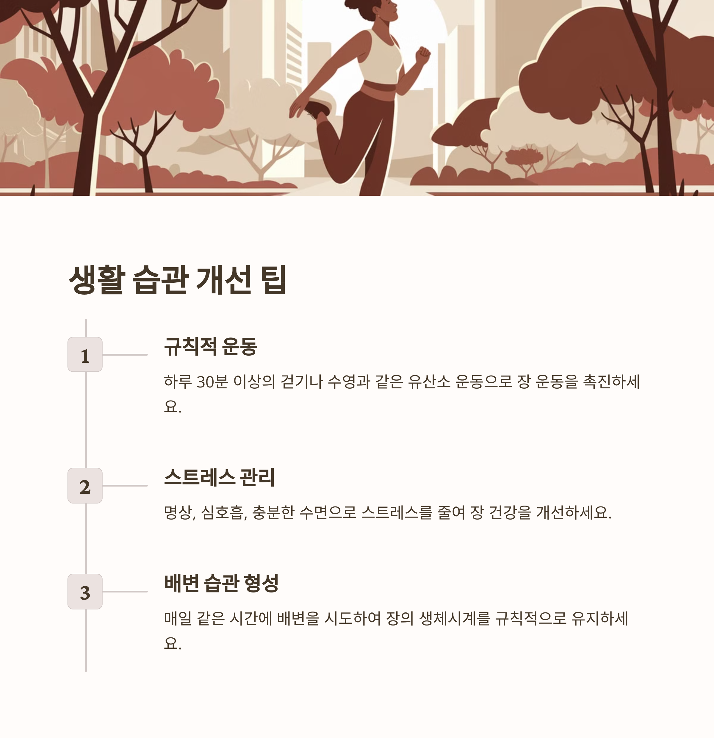 - 스트레스 관리: 명상, 심호흡, 취미 활동 등으로 스트레스를 관리하세요. 장은 '두 번째 뇌'라고 불릴 만큼 정신 상태와 밀접한 관련이 있어요.