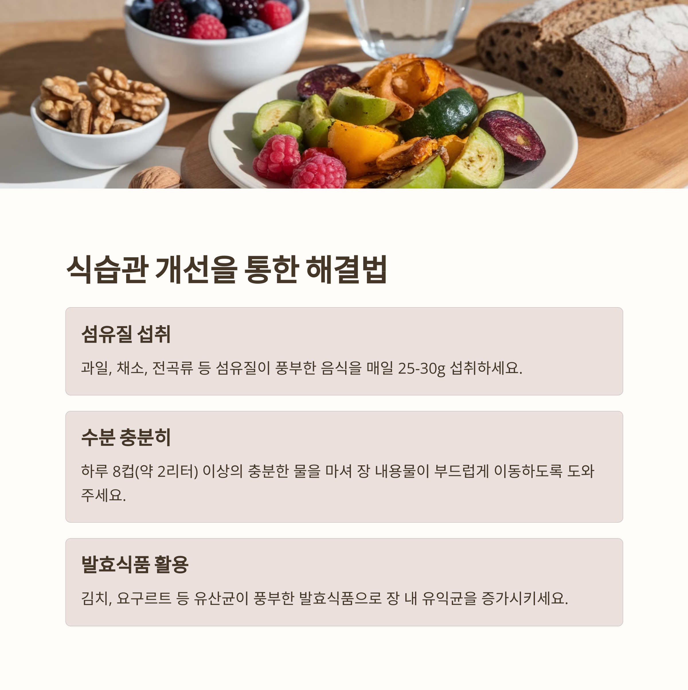 - 규칙적인 운동: 하루 30분 이상 걷기만 해도 장 운동이 활발해져요. 특히 아침 식사 후 가볍게 걷는 것은 배변 활동에 도움이 됩니다.