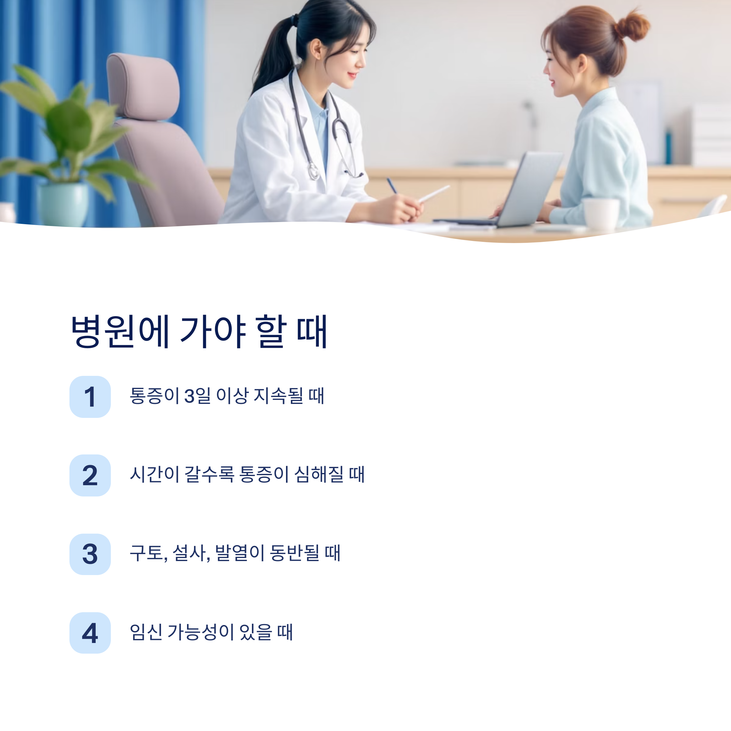 다음과 같은 증상이 있다면 즉시 병원에 가세요: - 통증이 3일 이상 지속되는 경우 - 시간이 갈수록 통증이 더 심해지는 경우 - 구토, 설사, 발열이 동반되는 경우 - 과거에 대장염이나 요로결석 병력이 있는 경우 특히 여성의 경우 임신 가능성이 있다면 반드시 검사를 받아보세요.