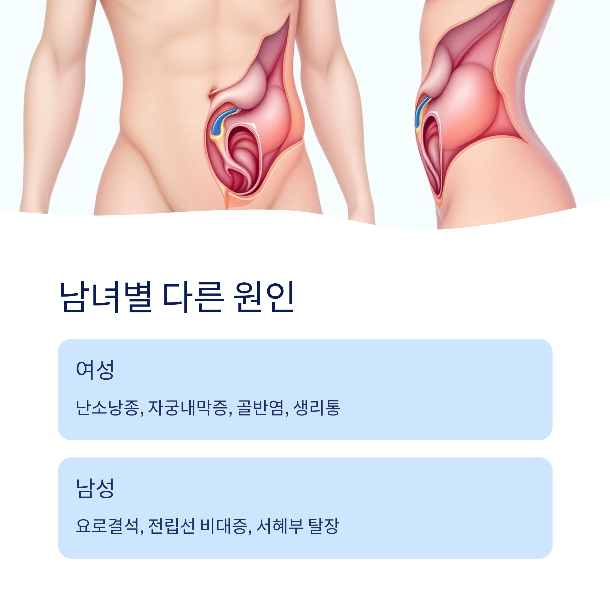 **여성의 경우 추가로 고려할 원인들:** - 난소낭종이나 자궁내막증 - 골반염이나 자궁근종 - 생리통이나 배란통 - 임신 초기 증상 **남성의 경우 주요 원인들:** - 요로결석이나 전립선 비대증 - 서혜부 탈장 - 정계정맥류