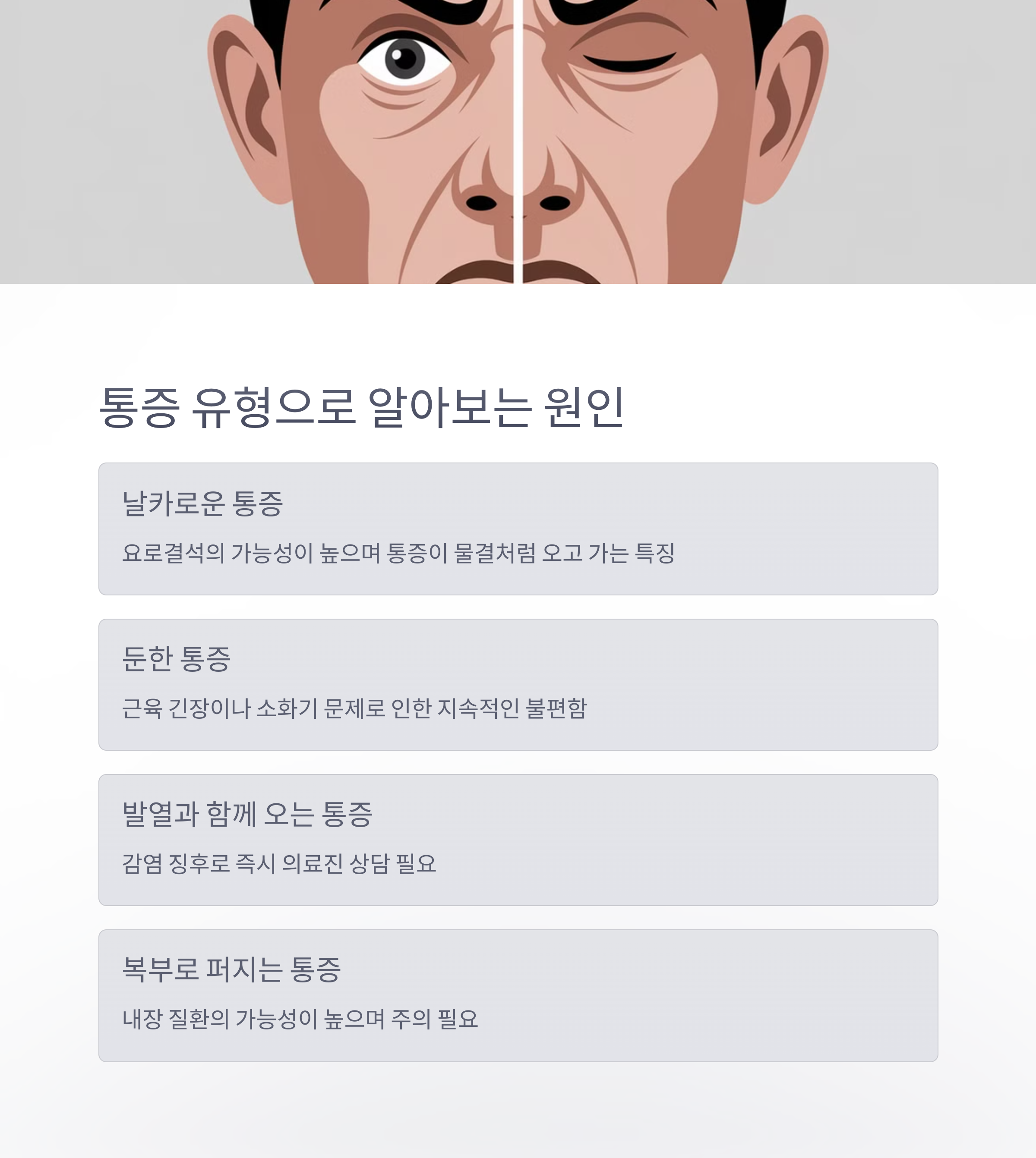 | 날카롭고 갑작스러운 통증 | 신장 결석, 근육 염좌 | 소변 시 통증, 혈뇨, 구역질 | 중간~높음 |