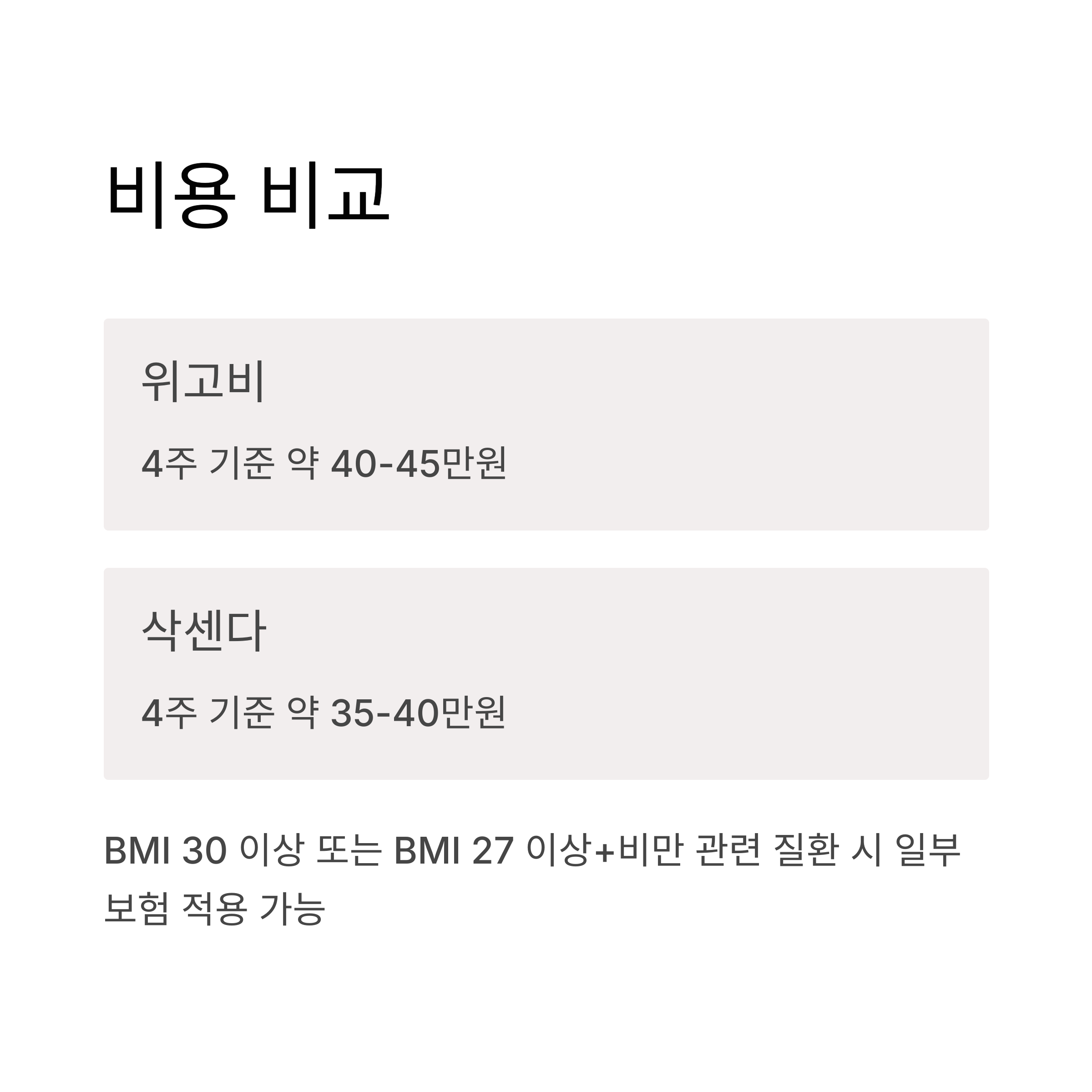 물론 보험 적용 여부에 따라 실제 부담하는 비용은 크게 달라질 수 있어요. 현재 국내에서는 특정 조건(BMI 30 이상 또는 BMI 27 이상이면서 비만 관련 질환이 있는 경우)을 충족하면 일부 보험 적용이 가능하니, 의사와 상담해보세요!
