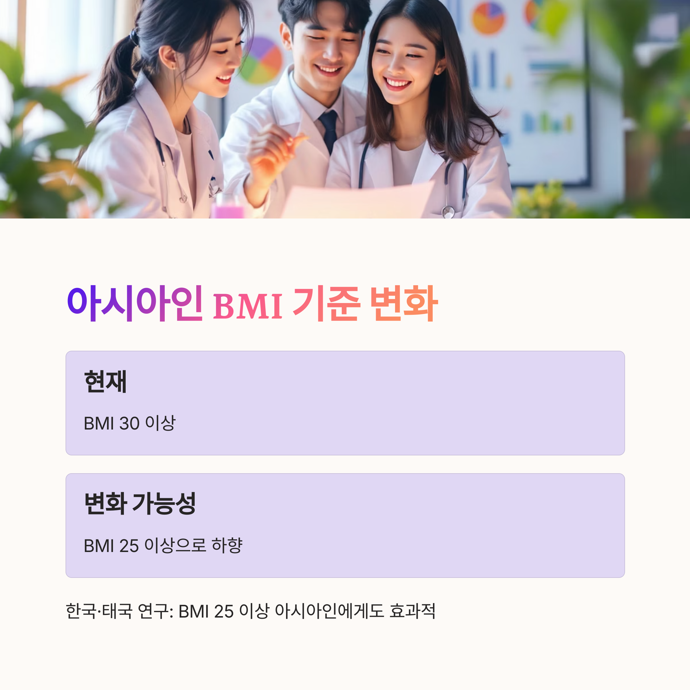 앞으로 위고비 처방 BMI 기준이 낮아질 가능성이 높아 보여요. 한국과 태국에서 진행된 연구에서 BMI 25kg/㎡ 이상인 아시아인에게도 위고비가 효과적이고 안전하다는 결과가 나왔거든요.