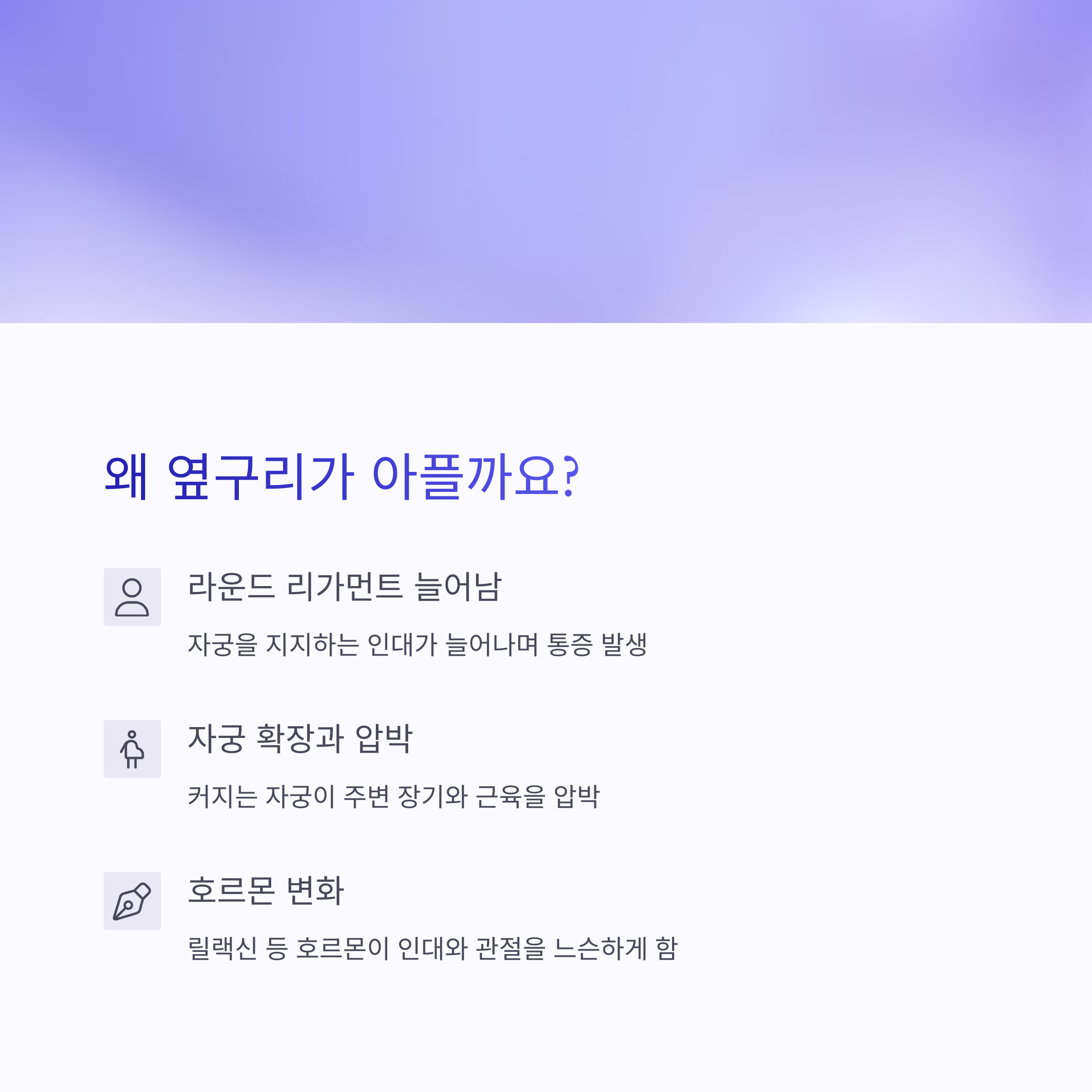 임신이 진행될수록 자궁이 커지면서 주변 장기와 근육을 압박하게 됩니다. 특히 후기로 갈수록 자궁은 가슴뼈 아래까지 올라와 갈비뼈와 옆구리에 압박을 가해 통증을 유발합니다[8].