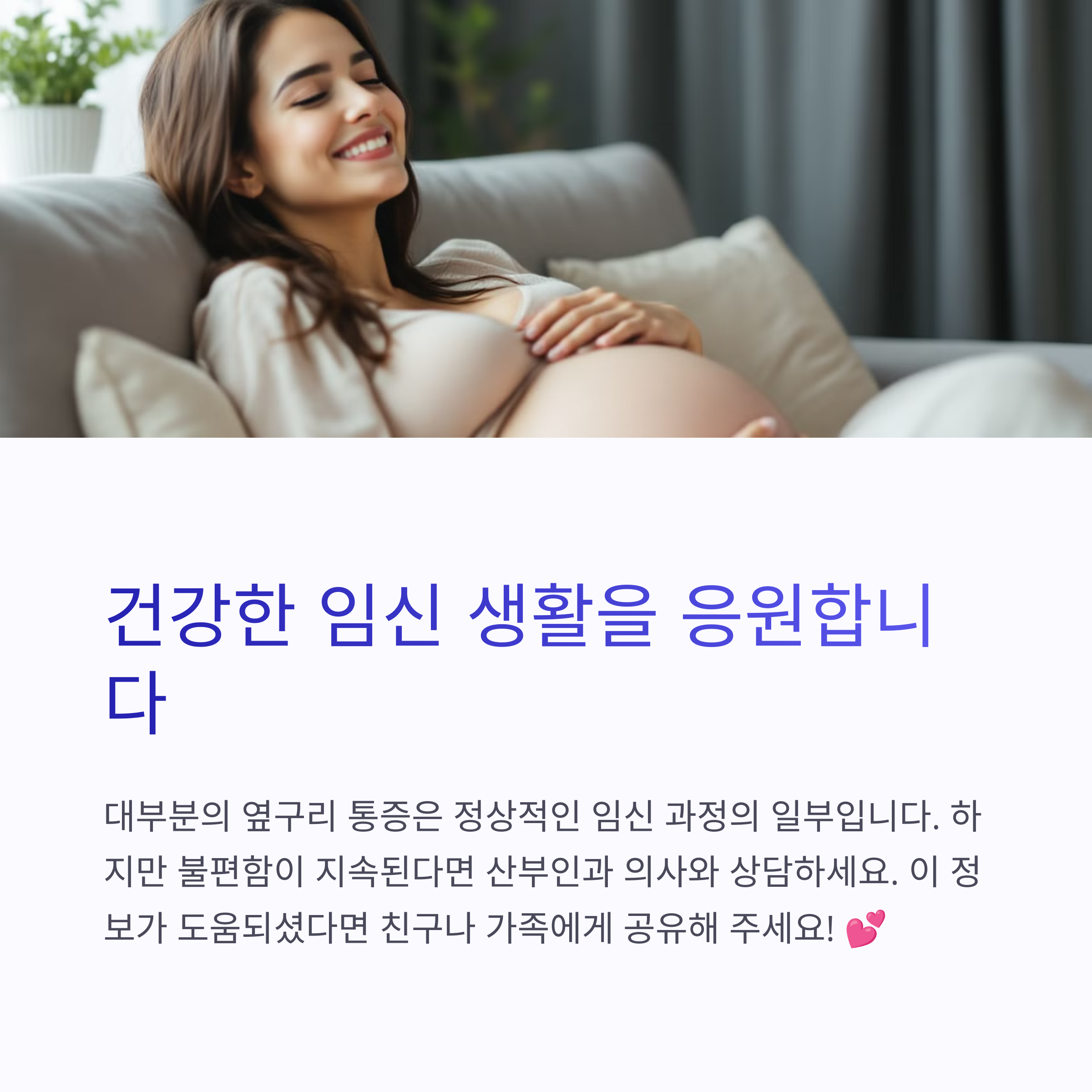 "임신 중 옆구리 통증은 대부분 자궁 인대가 늘어나면서 생기는 정상적인 현상입니다. 하지만 통증이 심하거나 다른 증상이 동반된다면 반드시 의료진과 상담하세요. 평소 규칙적인 스트레칭과 올바른 자세 유지, 충분한 휴식이 통증 완화에 도움이 됩니다. 특히 갑작스러운 움직임을 피하고 천천히 자세를 바꾸는 것이 중요합니다."