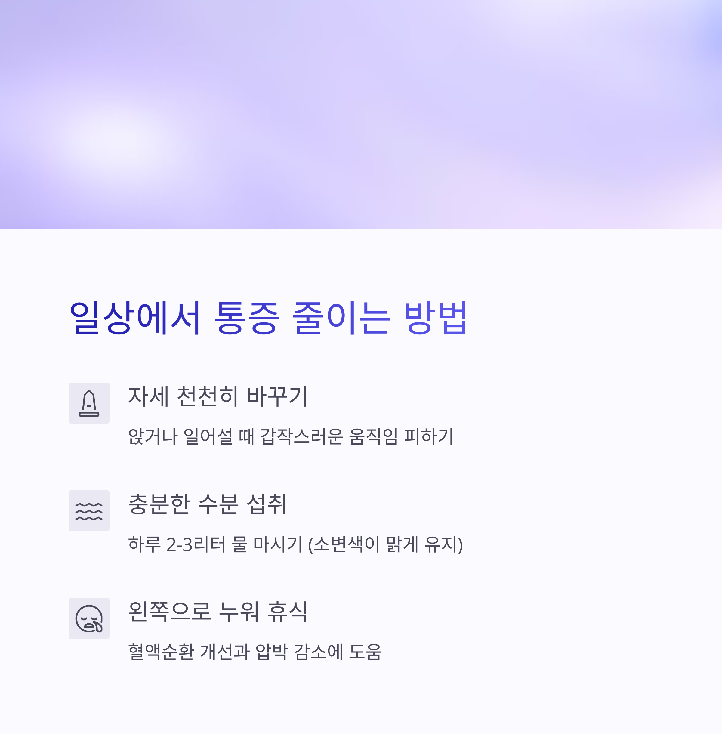 - 자세 천천히 바꾸기: 갑작스러운 움직임을 피하고 천천히 자세를 바꿉니다[3]