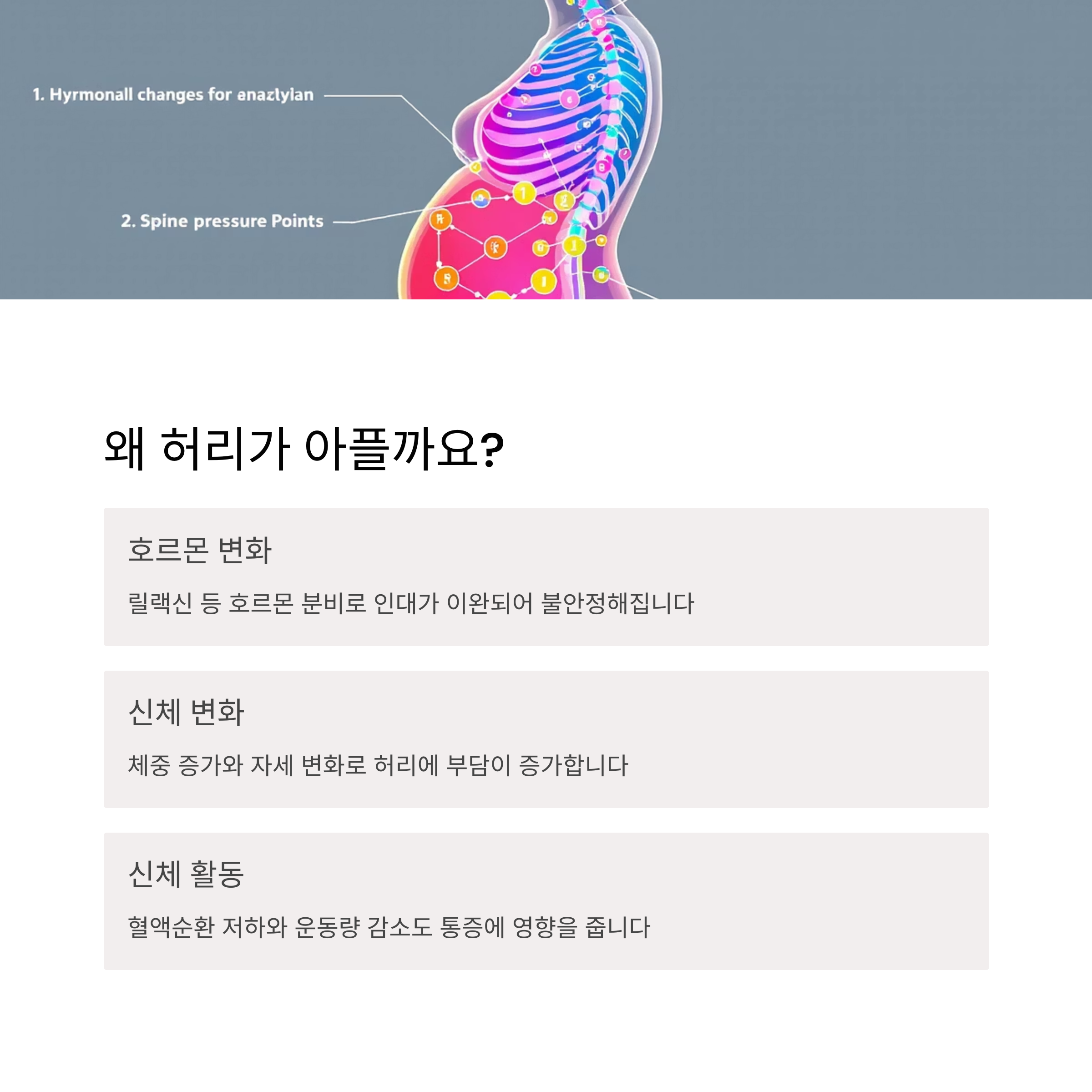 또한 임신 초기부터 자궁이 커지면서 골반의 중심이 변화하고, 이로 인해 척추에 가해지는 압력이 달라집니다. 이러한 변화는 평소 자세에도 영향을 미쳐 허리에 부담을 줍니다.