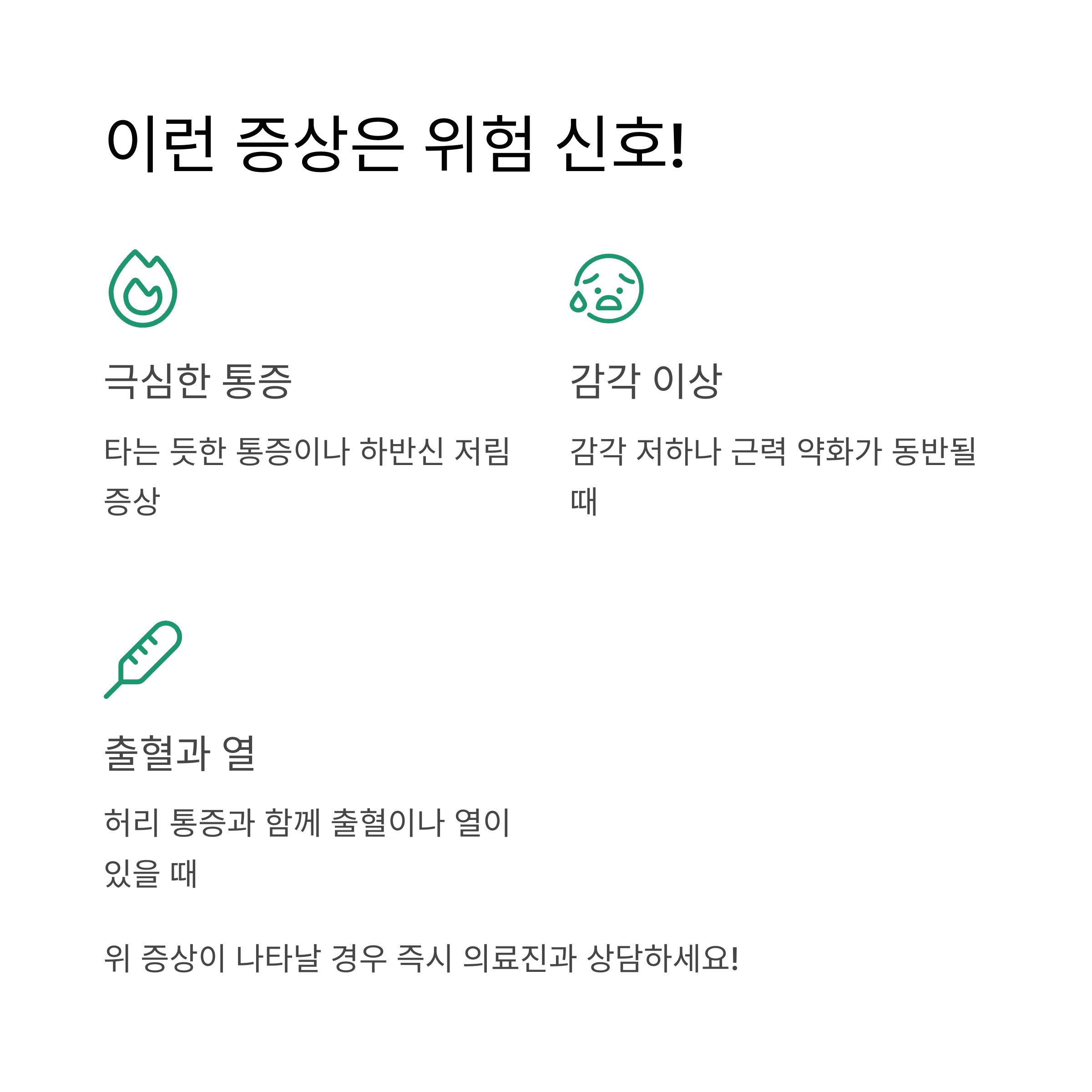 - 허리 통증과 함께 발열, 오한, 또는 배뇨 시 통증이 있을 때 (요로 감염 가능성)